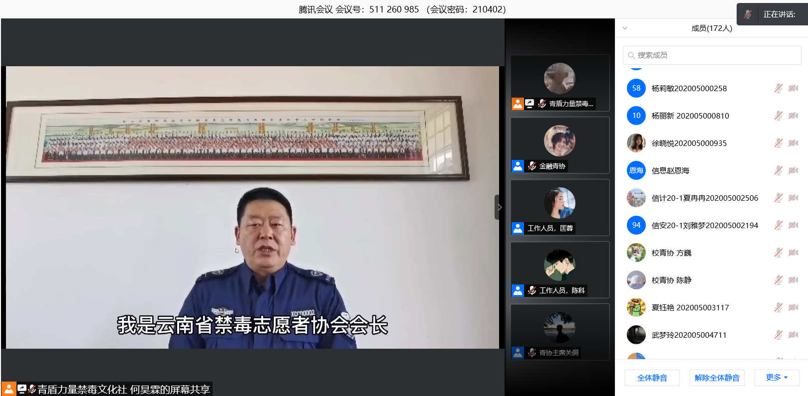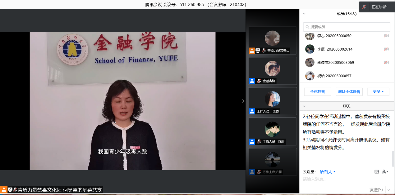 为进一步推进“6·27”青少年毒品预防教育工程,加大校园禁毒宣传力度,为青少年学生普及毒品和艾滋病防治知识,增强青少年学生的自我保护意识,筑牢校园拒毒防艾防线,4月2日下午15时,金融学院团委于腾讯会议召开第六届“青盾力量禁毒防艾”系列活动开幕式。云南省禁毒志愿者协会会长束佳骏先生、金融学院党委副书记汪薇萍老师、金融学院团委书记任琳老师、昆明理工大学青年志愿者联合会代表、william威廉中文官网十六家青年志愿者协会代表及十一家社团代表出席了本次开幕式。
