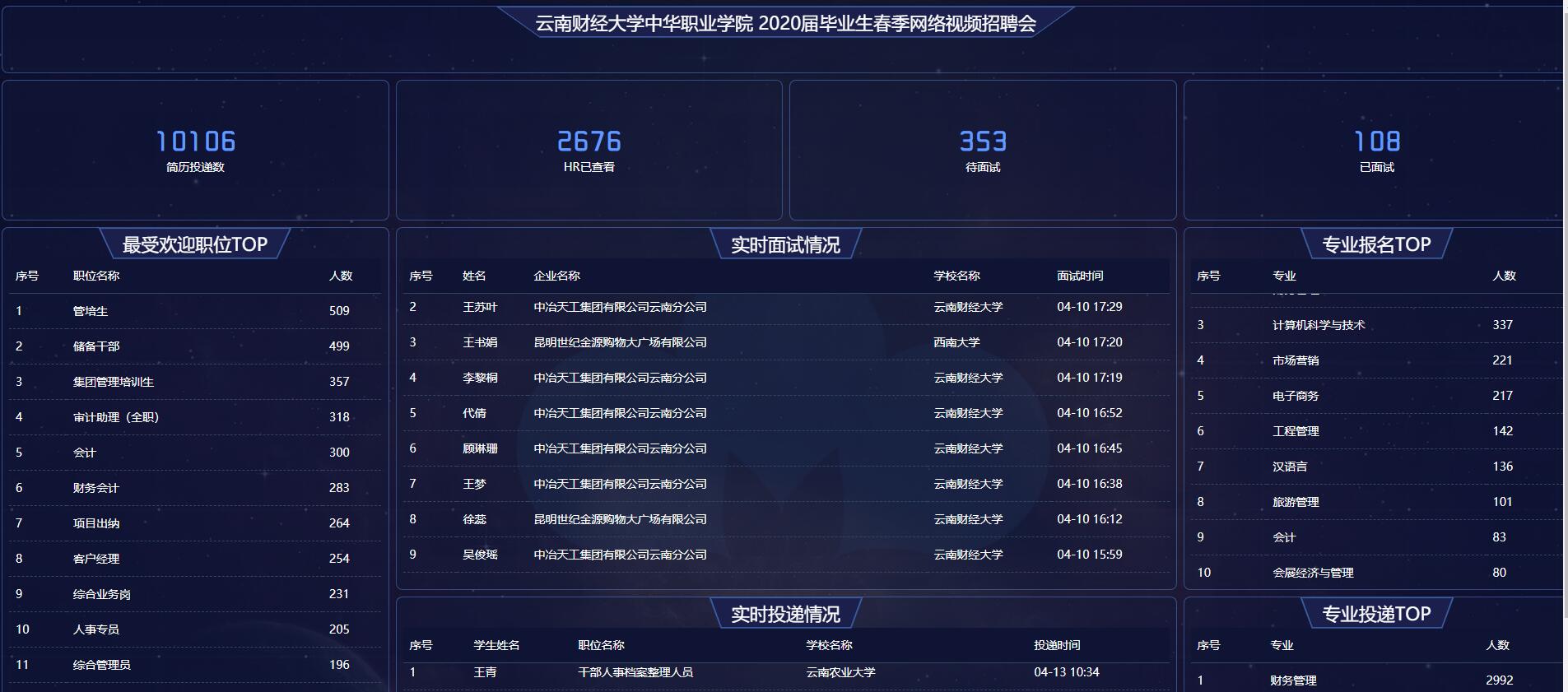4月10日,中华职业学院毕业生网络视频双选会在学校众创空间路演大厅举行,126家优质用人单位共提供就业岗位4797个,共3986人报名,其中学院2531名毕业生参与了此次网络双选会。学校党委副书记谢昌浩,副校长旷锦云到会指导工作,招生与职业发展中心副主任霍加军、张剑锋,学院全体领导、辅导员及毕业生班主任参加了此次双选会。双选会开幕式由学院党委书记吴应利主持。