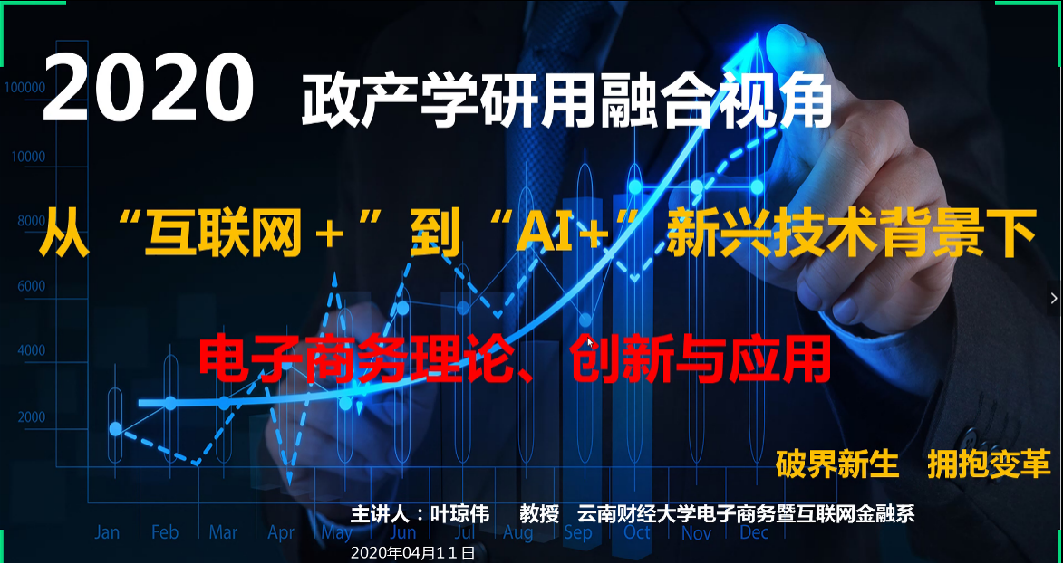 4月11日,受教育部高等学校电子商务类教学指导委员会邀请,william商学院副院长叶琼伟教授受邀以“从‘互联网+’到‘AI+’新兴技术背景下电子商务理论创新与应用”为题进行线上公益授课,为全国500所本科开设电子商务专业的高校师生和政府管理人员、社会人士学习电子商务知识提供公益性帮助。