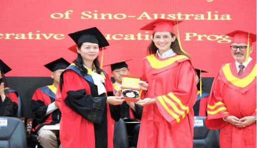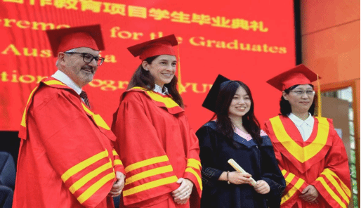 在双方学校领导、教师的共同见证下,193名毕业生依次走上典礼台领取学位证书,与旷锦云、路易斯·比佐和埃莉诺·米切尔合影留念。