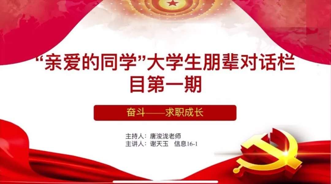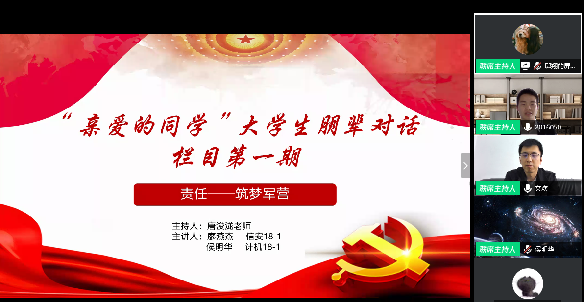 为激发大学生参军入伍热情,做好学业与求职规划,4月17日下午,信息学院首期“亲爱的同学”-大学生朋辈对话栏目围绕“责任·筑梦军营”“奋斗·求职成长”两个主题开展线上活动,入伍复学代表计机18-1班侯明华、信安18-1班廖燕杰和毕业生代表信息16-1班谢天玉三位同学与来自各年级的100余名同学通过腾讯会议进行了分享交流,活动由学院党委副书记唐浚泷主持。