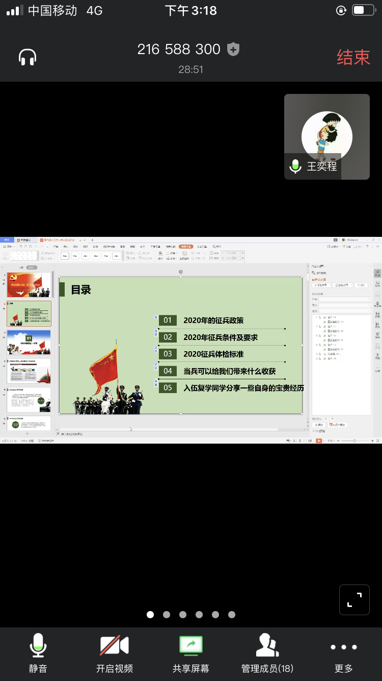 4月24日下午,现代设计艺术学院利用“腾讯视频”APP举行线上参军入伍政策宣传及入伍复学同学朋辈交流会。会议由学生科辅导员骆江霞主持,学院党委副书记沙磊,19级退伍同学生王奕程、李自荣以及学院有意入伍的学生参加会议。