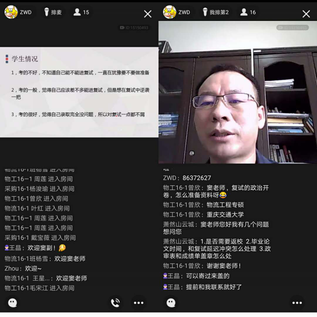 4月28日下午,物流学院通过QQ群组织开展了考研复试线上指导讲座,本次讲座由学生科科长王晶老师主持,学院副院长窦志武教授主讲,学院2020届全体考研上线学生参加。