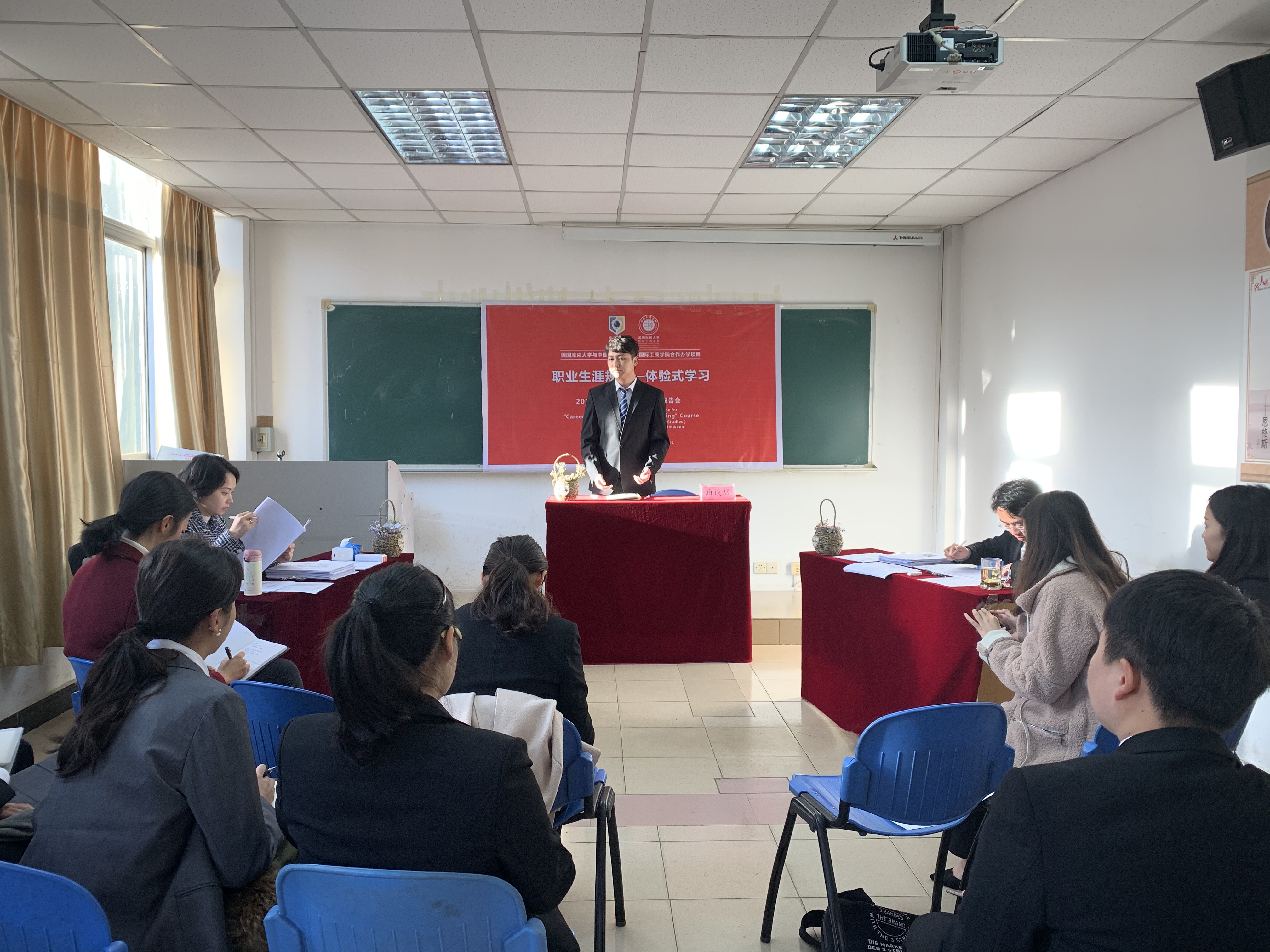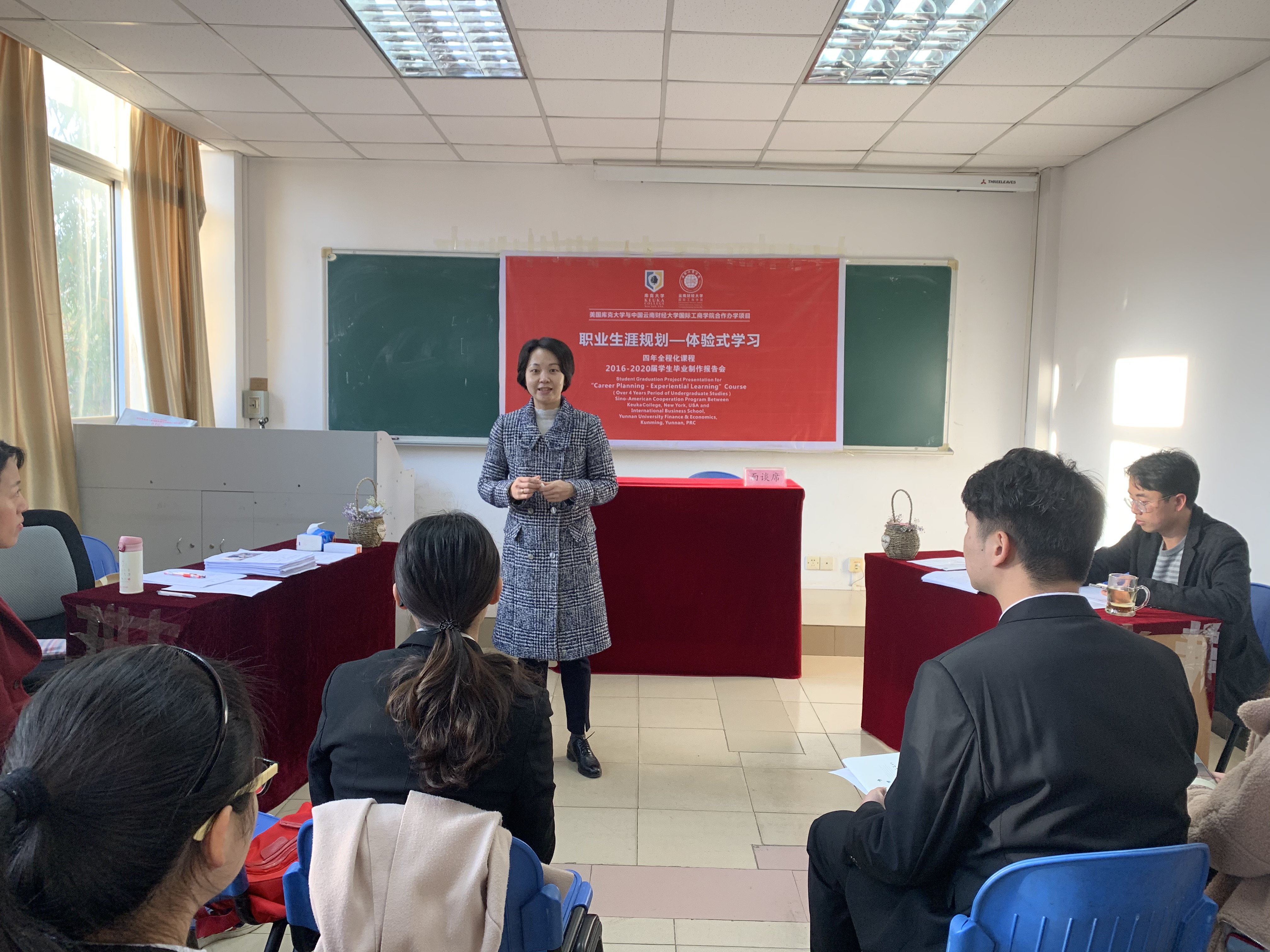 根据国际工商学院《生涯管理与体验式学习》课程教学安排,美国库克大学黄天中教授委托库克中国助理教授陆丹于12月24日至12月29日在汇新楼106教室为2016级中美合作项目国际经济与贸易专业178名同学开展毕业设计面谈指导教学。
