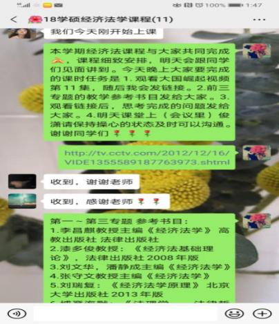副院长马慧娟老师担任专业硕士与学术硕士《经济法专题》与《经济法学》课程教学。在前期的教学准备过程中,测试多个教学平台后确定“腾讯会议”进行直播教学,同时建立课程教学微信群。线上课程课程教学中,釆用了教学之前、之中、之后的“三环节把控法”确保教学活动顺利开展。即课程之前,与学生充分沟通交流教学方法细节,明确教学任务并推送视频、参考书目和相关材料。课程之中,注重教学重点与难点的启发和互动。课程之后,注重收集相关问题与建议,并提示下一次课程的内容与难点。课程完成,对于新的教学方式,同学们表示课程信息量大、关注面广,这样的教学方式循循善诱又生动活泼,学生们一声声谢谢老师,表达了更加投入学习和喜欢这教学方式的声音。