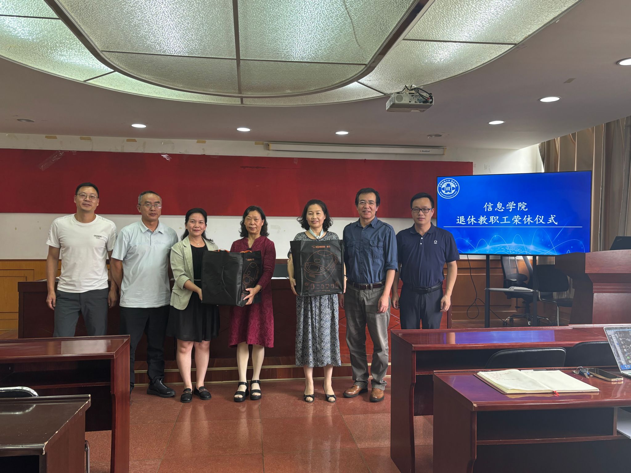 为感谢退休教师的辛勤耕耘和默默坚守,增强教师职业的荣誉感、归属感,6月21日下午,信息学院召开教职工大会,为两位退休教师举行荣休仪式。学院党委书记李娟、院长余益民、党委副书记李卫东、副院长赵成贵、副院长徐兴贵及学院全体教职工参加仪式。