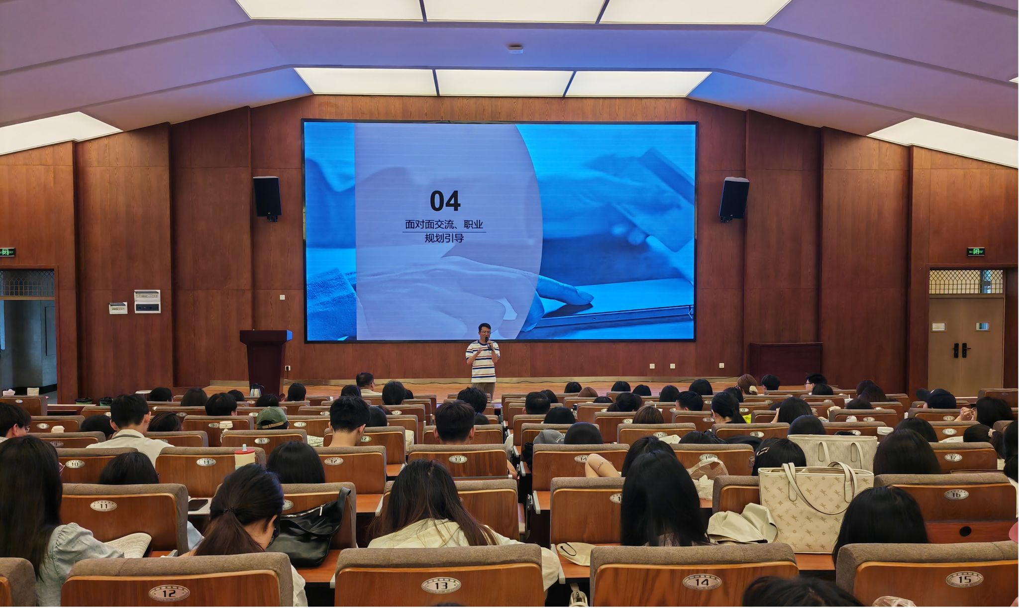 张珉恺以“坚守初心 绽放青春”为主题回顾了在校期间的学习与成长经历,讲述了个人职业发展和投身社会服务基层的奋斗历程。在互动环节,他一一解答同学们提出的有关专业学习、职业规划、求职备考等方面的问题。