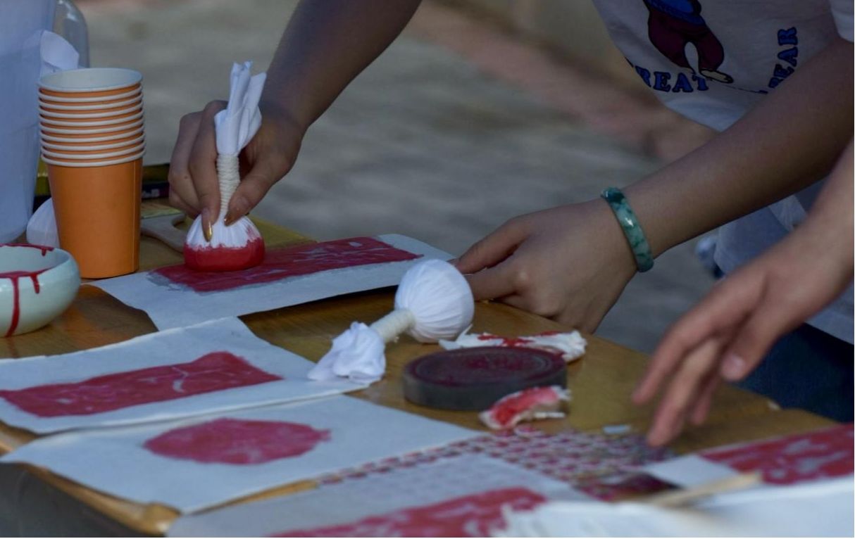 活动包含绘画创作、文化体验、游戏互动和手工制作4大区域30个特色项目。书法展示区的墨香四溢吸引师生驻足,传统射艺体验区妙趣横生,棋艺对弈区展现智慧交锋,而融合书法艺术的漆扇制作、创意拼豆和传统扎染等互动项目参与度高,营造了浓厚的传统文化氛围。