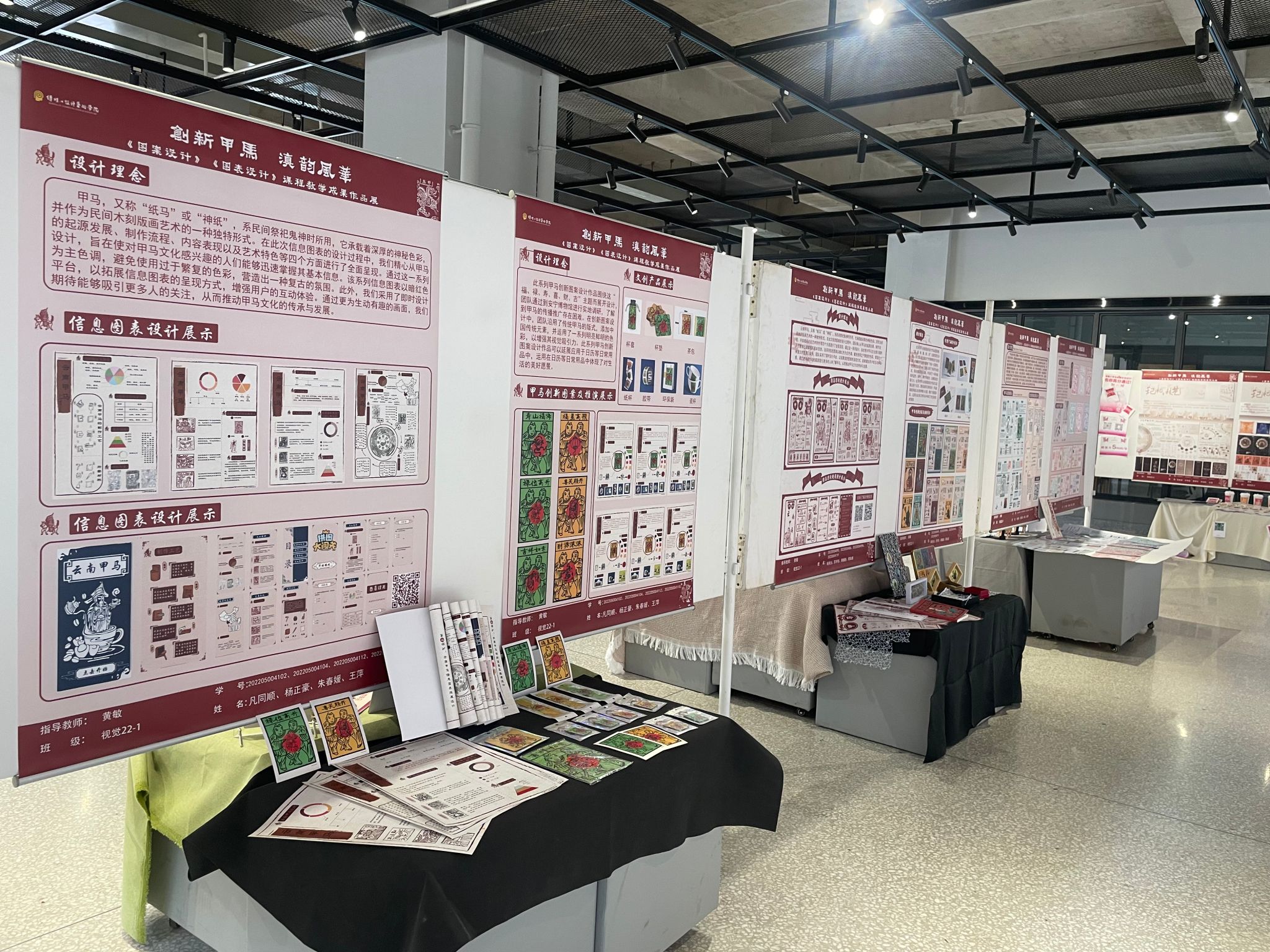 为全面提升本科教育教学质量,提高课程内涵建设,扎实推进艺术学科专业课程建设及党建引领支部建设的作用,6月28日,由安宁市博物馆,传媒与设计艺术学院本科生第二党支部(教育部第四批“全国党建工作样板支部”培育创建单位)、视觉传达设计系共同策划组织的“创新甲马 滇韵风华”——《图案设计》《图表设计》课程教学成果作品展在安宁校区齐远楼大厅开展。