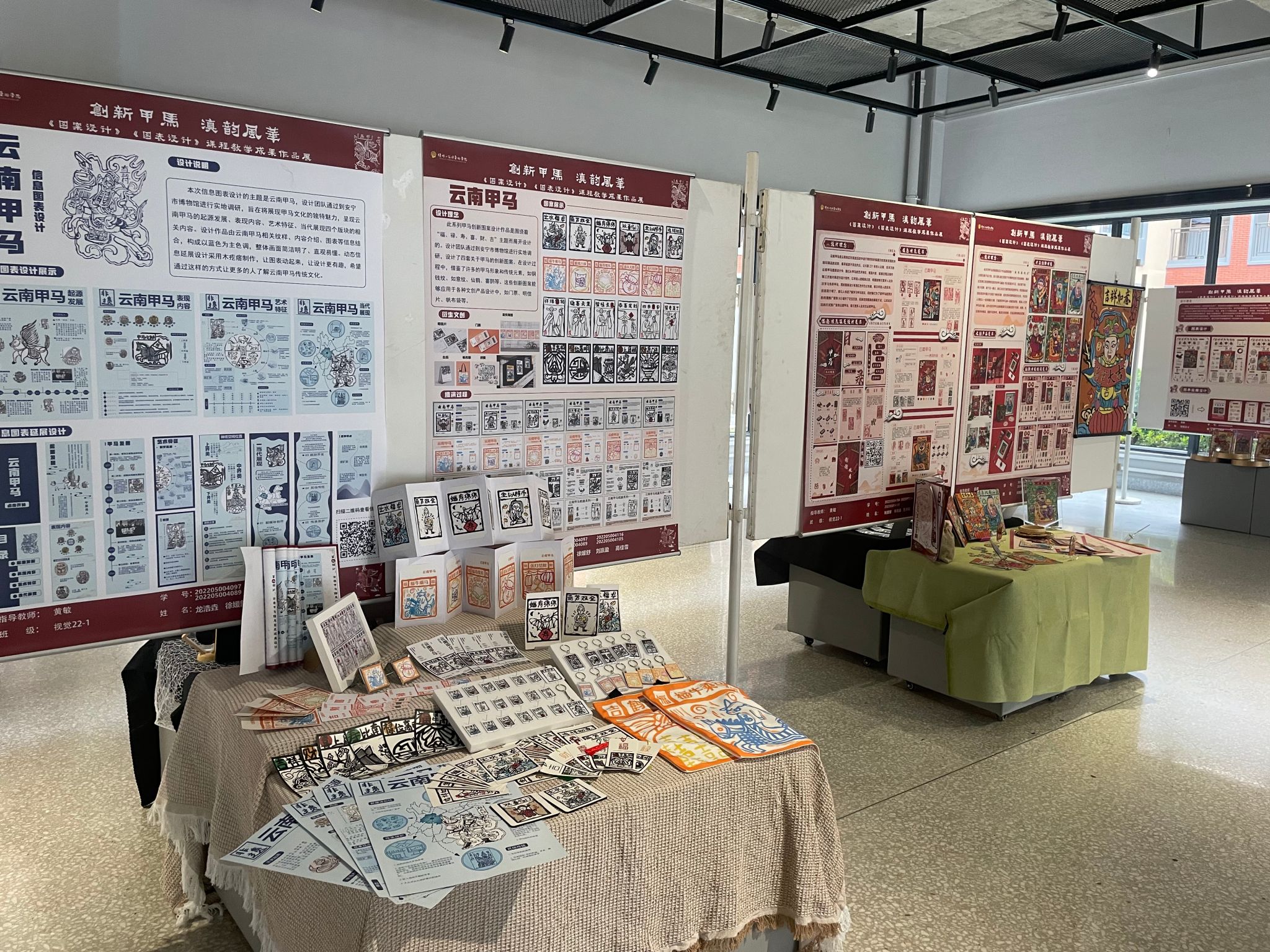 本次展览作品由视觉传达设计系黄敏老师指导,视觉传达设计22-1、22-2班学生创作完成。学生们通过到安宁市博物馆进行实地调研,通过设计、分析、制作等相关教学实践环节,完成了安宁市博物馆甲马藏品视觉推广及文创设计研究内容。