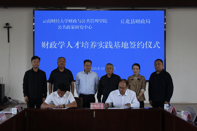 10月18日,财政与公共管理学院、公共政策研究中心与文山壮族苗族自治州丘北县财政局举行财政学人才培养实践基地共建协议签约仪式暨省级财政学拔尖创新班系列实践教学活动。学校财政学专业负责人伏润民教授,文山州财政局党委书记、局长吴长明,丘北县委常委、常务副县长林志坚出席。丘北县财政局局长谢金伍主持会议并与财政与公共管理学院副院长和立道代表双方签署《财政学人才培养实践基地共建协议》。