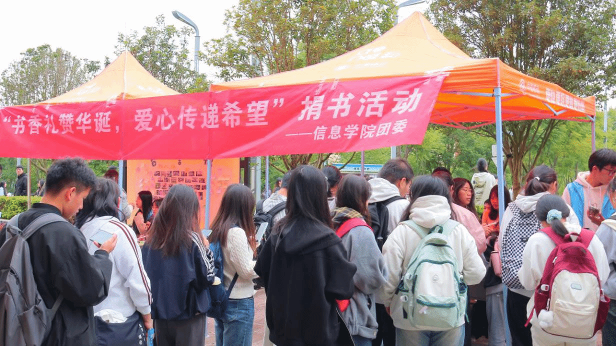 2025年10月22日至10月24日,信息学院团委联合校妇联、学校驻村工作队、金融学院青年志愿者协会、统计与数学学院青年志愿者协会开展为期三天的“书香礼赞华诞,爱心传递希望”爱心捐书活动。本次活动在龙泉校区南院图书馆门口、北院梧桐餐厅门口以及安宁校区木莲餐厅门口设立了捐赠点。