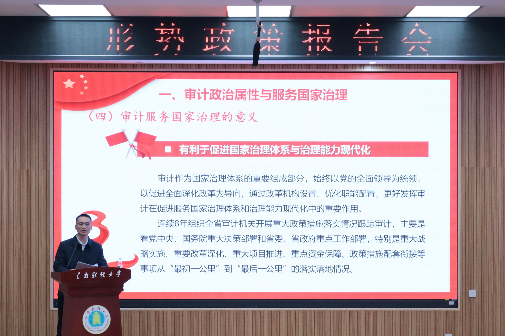 付云昆鼓励参加形势政策报告会的青年学生,一要坚定理想信念,深学细悟习近平新时代中国特色社会主义思想,筑牢政治根基;二要锤炼专业本领,扎实掌握财经审计知识与前沿技能,练就过硬本领;三要勇担时代使命,将个人成长融入国家发展,在民族复兴征程中贡献青春力量。