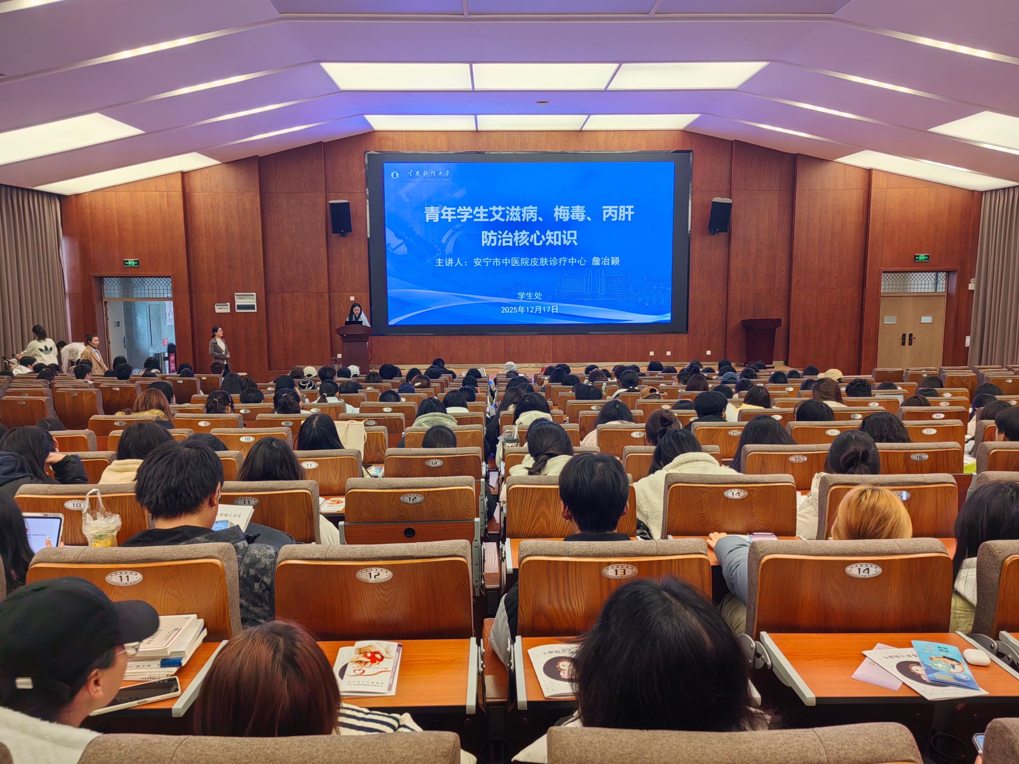 12月17日,学校在安宁校区举办健康知识专题讲座及知识竞答活动,邀请安宁市中医院皮肤诊疗中心医生詹冶颖、李彬彬围绕传染病防治及皮肤健康等内容进行讲解,并与学生开展现场交流。