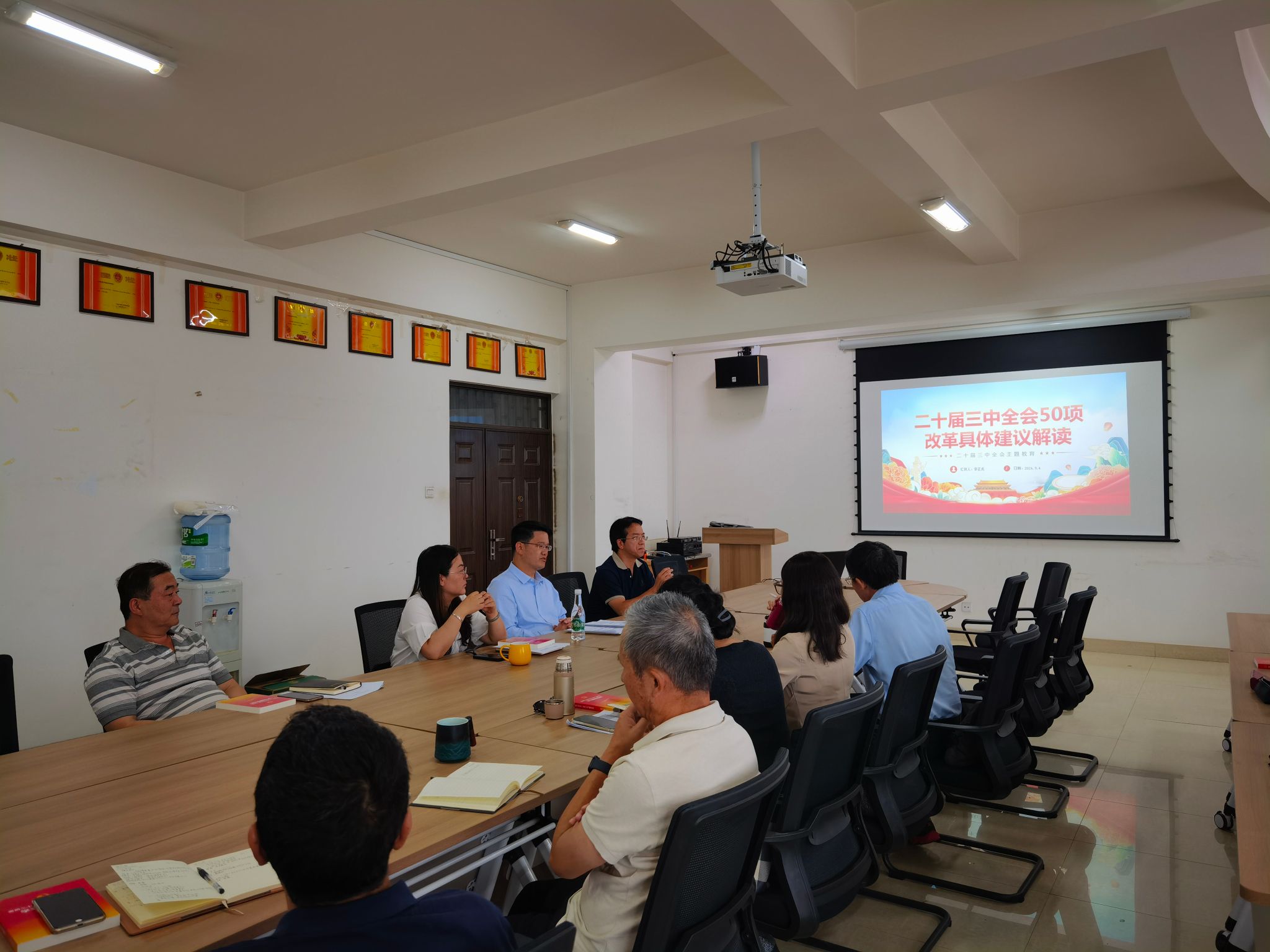9月4日中午,科研院所(中心)党委理论学习中心组开展专题学习,深入学习贯彻党的二十届三中全会精神,学校党委委员、副校长李正彪领学,科技处处长段云龙参加学习。会议由科研院所(中心)党委书记曾蕾主持。