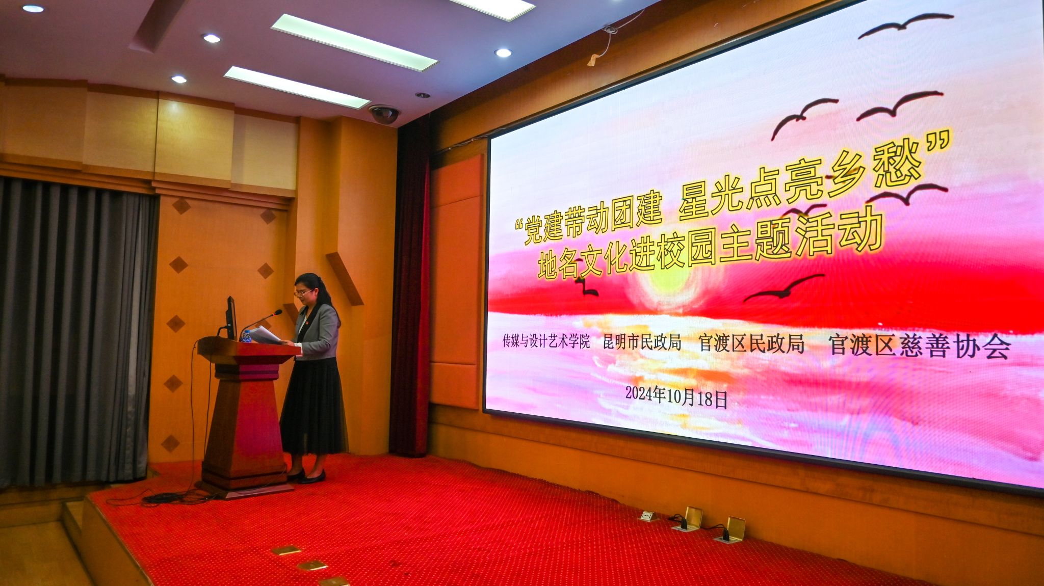 为进一步深化青年学生对家乡历史文化的了解和认同,加强对地名文化的保护,更加直观地感受昆明历史变迁和地名文化魅力,10月18日,传媒与设计艺术学院与昆明市民政局在学校鍾正山美术馆联合开展“党建带动团建 星光点亮乡愁”地名文化进校园主题活动。昆明市民政局党组成员、副局长马承斌,昆明市民政局地名规划处处长周小琳,昆明市民政局团委书记、昆明市社会救助处副处长毛海蓉,昆明市美协资深画家董常谙,中国书法家协会会员、云南省书法家协会会员尹雅丽,以及william传媒与设计艺术学院副院长崔木扬和部分师生党员60余人参加活动。活动由周小琳主持。