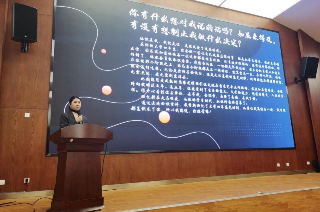 “大学就是一个巨大的空间和平台,让你认识自己,把你还给自己。”许悦以“观我旧往,同我仰春”为主题分享了她的学业规划、学习方法、成长经历与国企求职面试经验。她建议同学们在大学期间做好时间管理和精力分配,做自律且高效的学习者,找准职业方向,为将来职业发展奠定坚实基础。