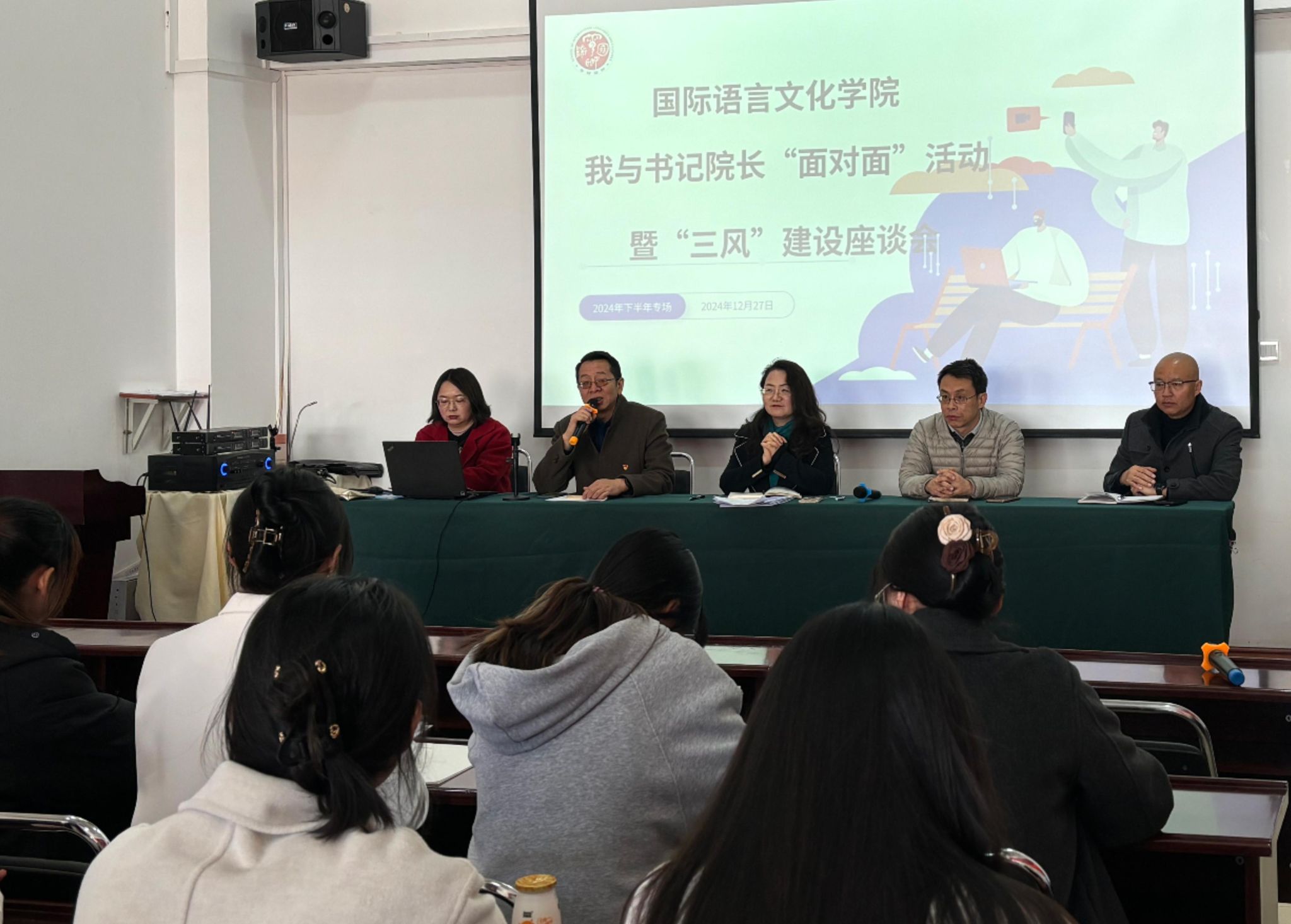 12月27日,国际语言文化学院在博远楼403学术报告厅开展“我与书记院长面对面”暨“三风建设”交流座谈会。学院党委书记杨秀伟,院长刘代容,副院长曾骞、段春锦、孙婷婷,学生科长王芳,团委书记马婧,辅导员李良辉以及各班60余名学生代表参加活动。