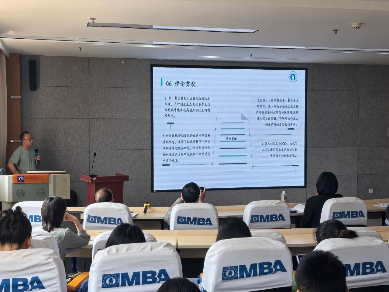 商学院两名青年教师程建青副教授、杨荣静博士分别以“经济波动下创业生态系统如何驱动高创业活跃度?——基于制度组态演化的动态QCA分析”和“中美技术管制政策评估:基于多源数据与机器学习的因果效应分析”为主题进行了论文汇报。点评专家有针对性地提出修改意见和建议,与会师生积极参与互动研讨,激发了创新思维。