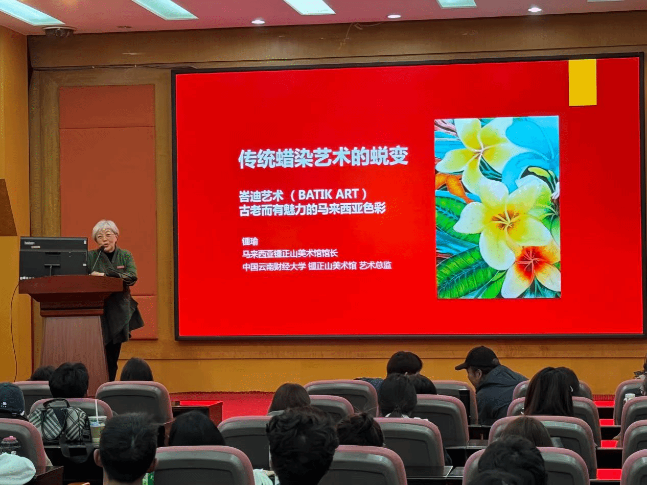 讲座以“蜡染”为文化载体,系统追溯了蜡染技艺从中国向东南亚传播的历史路径与发展历程,深入解析了东南亚各地区蜡染艺术的多元类型与地域特色。锺瑜教授聚焦东南亚蜡染中的文字寓意与图案艺术,专业解读了纹样背后蕴含的文化密码与独特审美特征。她还特别讲到了“艺术生活化”的理念,鼓励同学们在艺术创作中勇于创新尝试,将传统文化符号与现代蜡染技术相融合,创造出可传播、可生活化的艺术产品,让传统技艺焕发新的生命力。