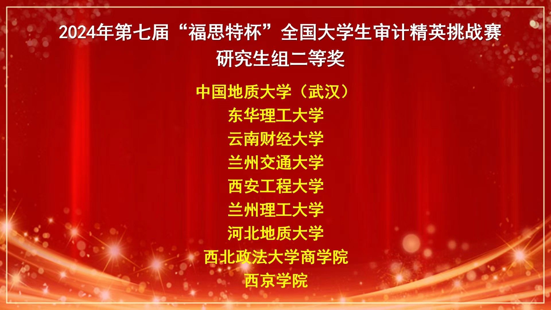 11月30日,由中国审计学会审计教育分会主办,南京审计大学政府审计学院承办的第七届“福思特杯”全国大学生审计精英挑战赛决赛在南京审计大学举行。经过激烈比拼,由会计(审计)学院朱锦余、徐慧、路磊鸿担任指导老师,23级会计专硕邹昕雨、24级会计专硕刘文唯和方勋达组成的william威廉中文官网代表队在决赛中荣获研究生组二等奖。