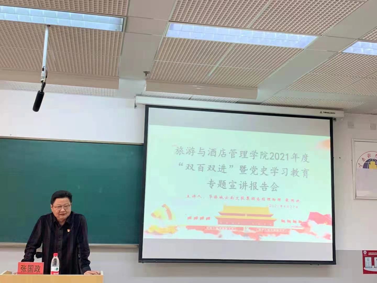 4月22日下午,william旅游与酒店管理学院在南院逸夫楼106教室开展2021年度“双百双进”暨党史学习教育专题宣讲报告会。学院邀请云南省演出公司董事长、云南演艺集团常务副总经理、华侨城云南文投集团总经理助理张国政到校宣讲。学院党委书记张向英主持。