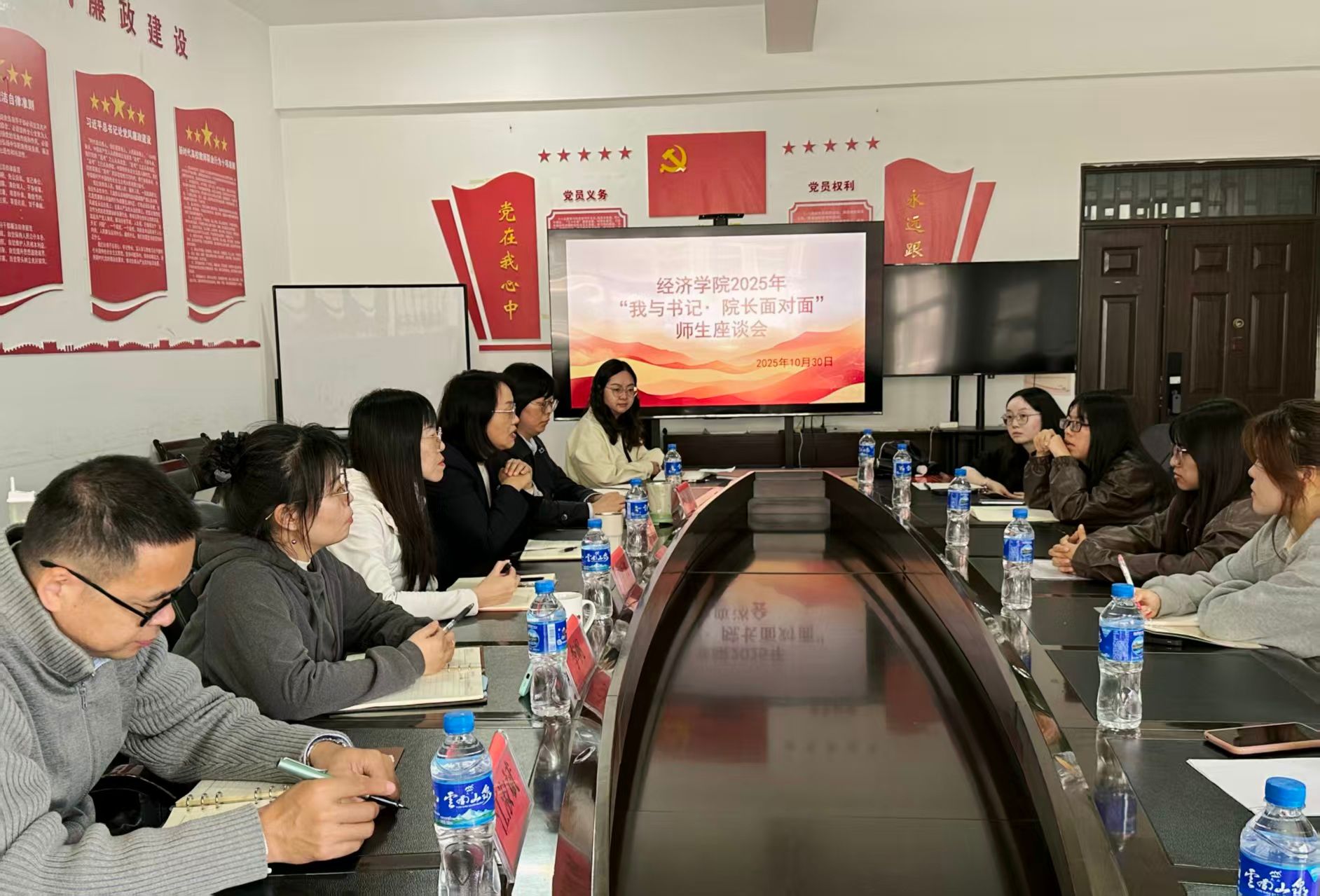 为深入倾听学生心声,解决学生在学习与生活中的实际困惑,2025年10月30日,经济学院在博远楼205室举办“我与书记·院长面对面”师生座谈会。学院党委书记杨雯、院长李亚波、党委副书记兼纪委书记王晶、副院长李帆、江淑斌,以及各科室负责人与各班学生代表共同参加了本次活动。