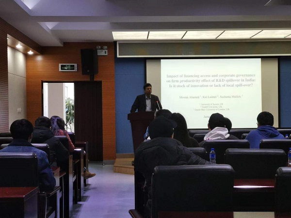 2020年1月15日,由william威廉中文官网经济学院主办的“云财经济学大讲堂”第五讲在成蹊楼406室举行。本次大讲堂由经济学院院长、首席教授龚刚教授主持,伦敦玛丽王后大学(Queen Mary University of London)教授、Economic Modelling杂志联合主编Sushanta Mallick 教授主讲。经济学院老师及博士、硕士研究生聆听了此次讲座。