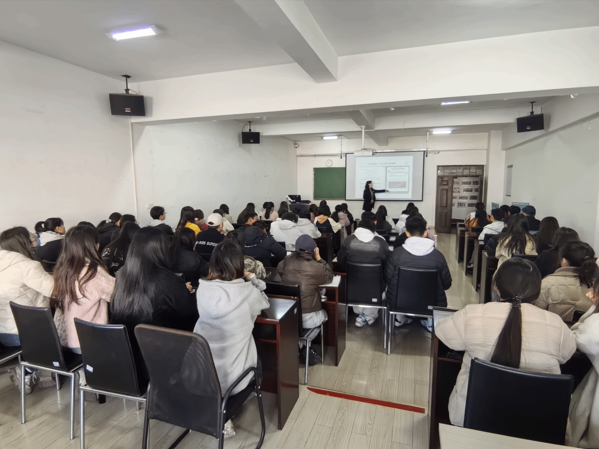 1215日下午,校党委委员、副校长旷锦云为经济学院学生讲授形势与政策课。旷锦云以《学习贯彻党的二十届四中全会精神,为推进中国式现代化贡献更多教育力量》为题,从学习党的二十届四中全会精神、贯彻落实党的二十届四中全会精神两个方面为同学们进行了一场生动的形势与政策理论宣讲。