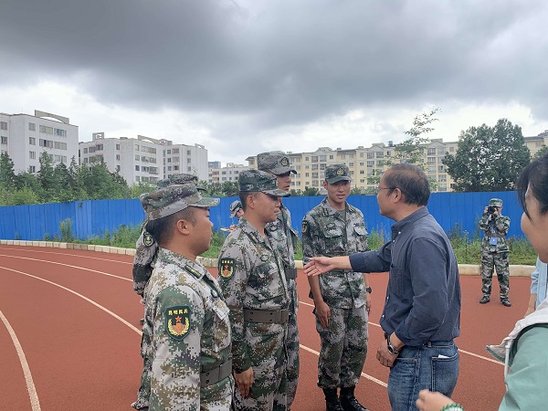2021年7月6日下午,经济学院党委书记陈永飞、副书记杨雯、辅导员陈琳、杨宏伟到训练场看望慰问2019级参加军训的学生。
