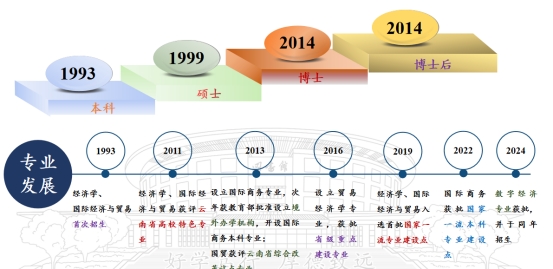 经济学院设有经济学、数字经济、国际经济与贸易、贸易经济和国际商务5个本科专业,拥有理论经济学、应用经济学2个一级学科博士授权点和2个一级学科博士后流动站,以及数字经济专硕授权点,实现了本-硕-博经济学人才培养全贯通。理论经济学入选云南省基础学科提升计划支持学科,应用经济学获评省级特色学科及重点支持学科。