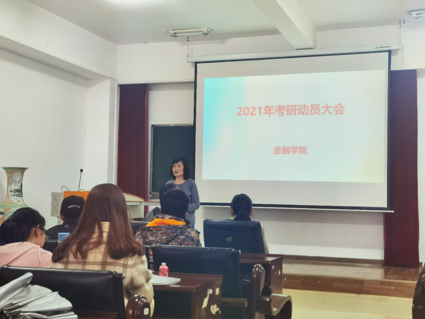 金融学院于2020年10月16日下午在博远楼103室举办了2021年考研动员大会暨研究生备考报考指导会。本次大会由金融学院党委副书记、纪委书记汪薇萍主持。副院长李江城、学生管理科科长郭良骥、学院研究生管理科李霄主讲,同时还邀请了今年考上研究生的同学分享考研经验,解答疑问。2017、2018级报考研究生的同学积极参与。