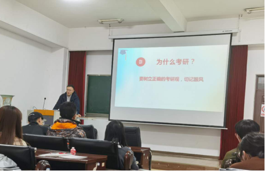 首先,李江城就“树立正确考研观”“如何准备考研”等问题从专业角度出发与同学们交流,并鼓励同学们确定合适的考研目标,努力复习,积极备考。郭良骥老师通过分析目前就业情况,本科、研究生就业质量等数据等鼓励同学们积极报考研究生并就考研的概况、考研的学校以及考研的录取情况展开,向同学们展示了高校毕业人数、考研选择及招生人数变化的柱状图,讲解关于考研的注意事项,使同学们认清当前考研的形式。李霄老师对同学们提出的问题进行解答,补充讲解了研究生考试、复试、录取工作的时间节点以及相关注意事项。