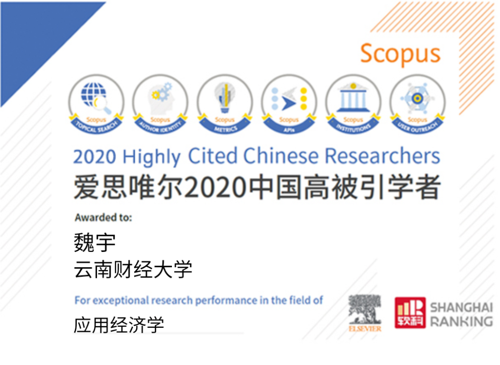 2021年4月22日,全球性信息分析公司爱思唯尔(Elsevier)正式发布了2020年中国高被引学者(Highly Cited Chinese Researchers)榜单。我院魏宇教授成功入选该榜单(应用经济学学科),此次入选应用经济学学科的高被引学者共50名。魏宇教授是william历史上首次入选爱思唯尔“中国高被引学者”(应用经济学学科)的教师。