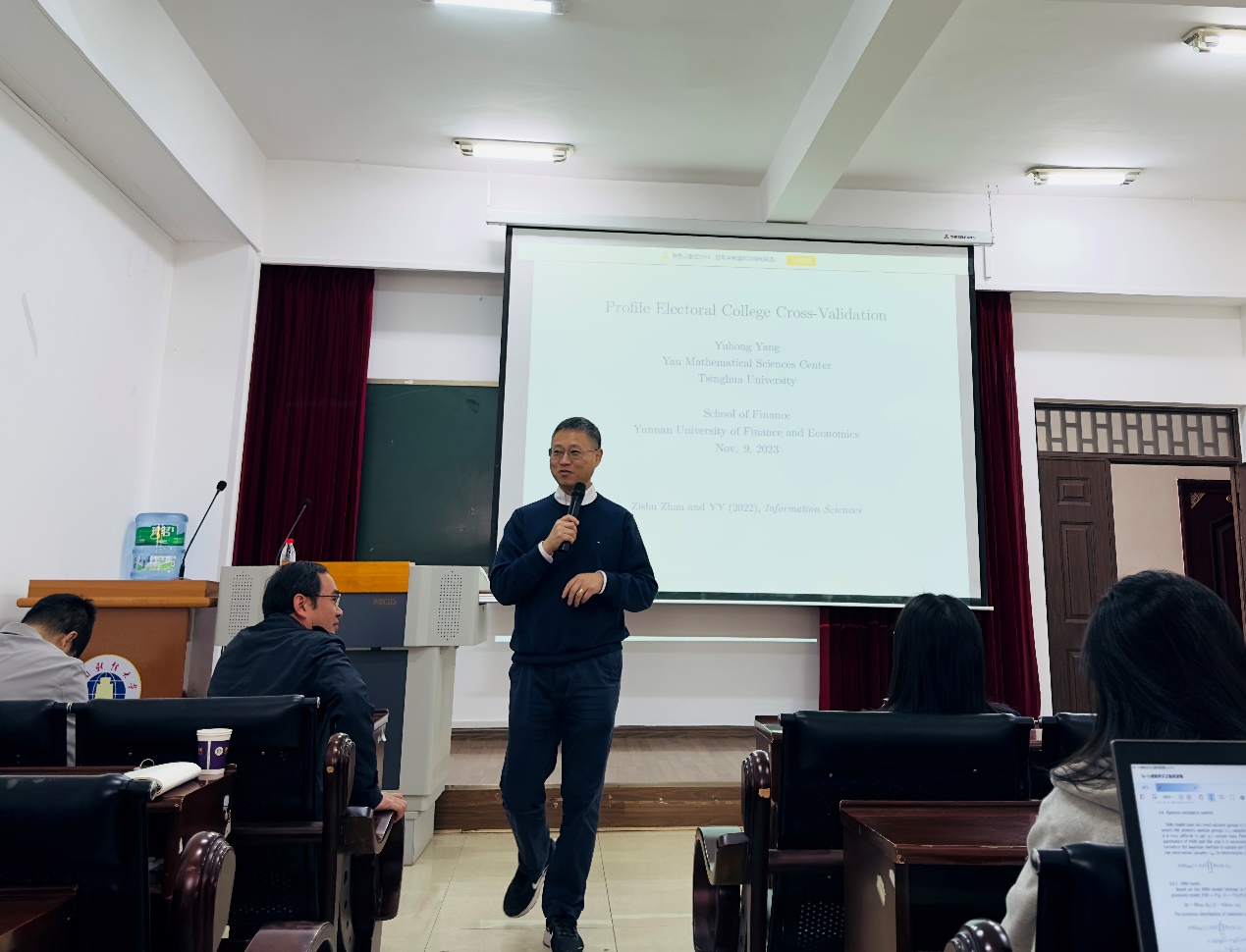 119日上午,应金融学院邀请,清华大学丘成桐数学科学中心教授杨宇红来院做学术讲座,主题为“Profile Electoral College Cross-Validation”,讲座由学院副院长李云仙教授主持。本次讲座吸引了学院教师、研究生以及兄弟院校的老师前来参加。