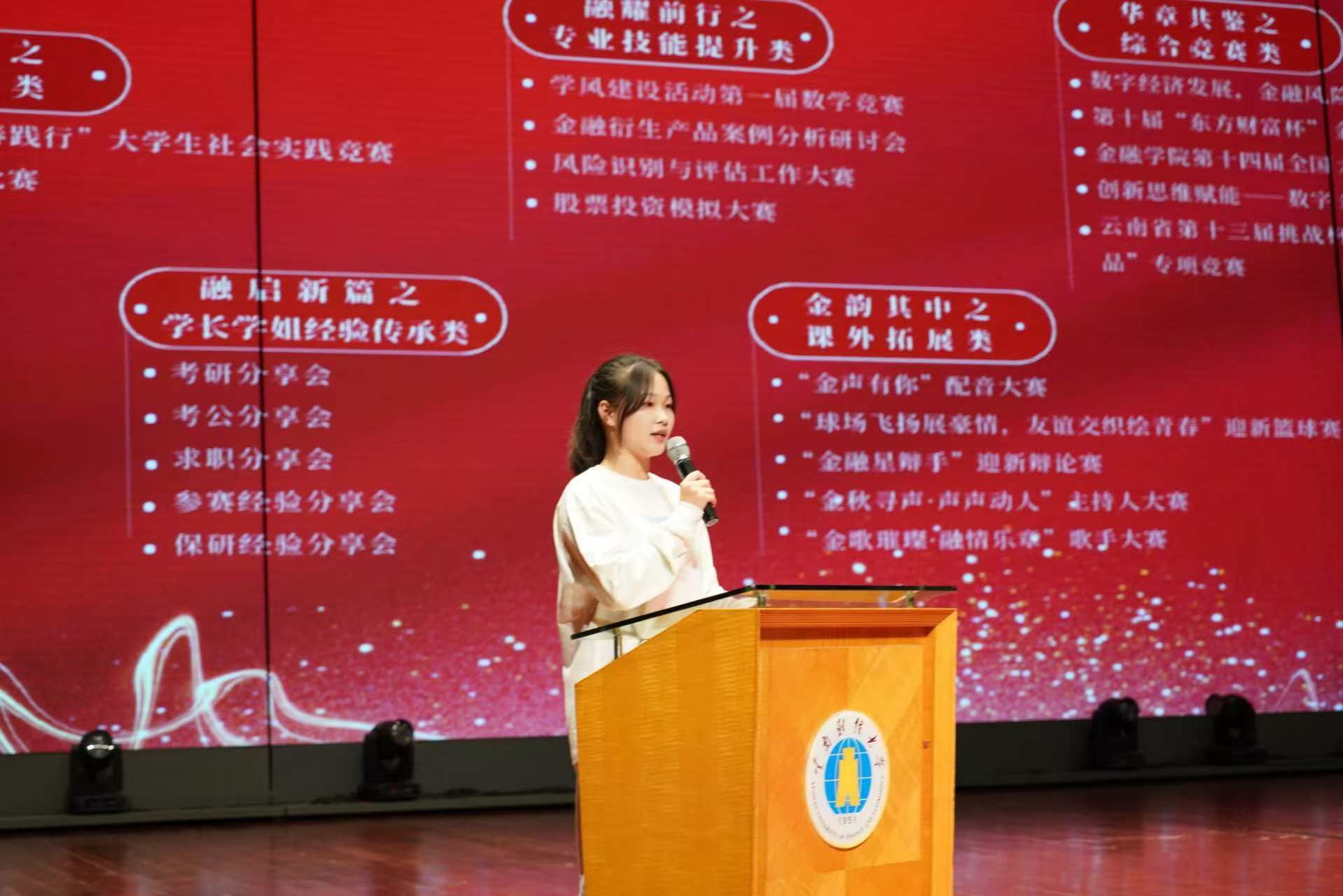 为提升同学们的金融素养和实践能力,推动金融教育深入发展,10月25日,金融学院第十一届金融文化节开幕式于北院汇文礼堂隆重举行。校团委书记舒挺、金融学院党委书记胡小珊,院长周伟,党委副书记郭丽仙,副院长李江城、杨国辉、李云仙以及学院特邀嘉宾:兴业银行昆明金街支行副行长龙希、云南OPPO市场部营销推广负责人刘思仑、正保教育云南分部总经理陈华嘉和云南分部校区经理郭悦出席开幕仪式。