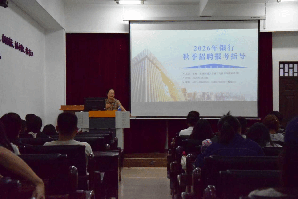 王彬老师从当前经济发展形势、高校毕业生就业前景等背景出发,深入剖析大学生就业难的深层原因,详细介绍国有企业和银行的职业发展优势,引导学生重点关注央国企、银行等优质就业方向。施允辉老师结合各大银行2026年度秋招计划,系统解析校园招聘全流程,重点讲解简历撰写、网申报名等技巧性内容,同时分析了央国企岗位的专业要求、考试内容与难度,指导学生制定科学合理的备考计划。