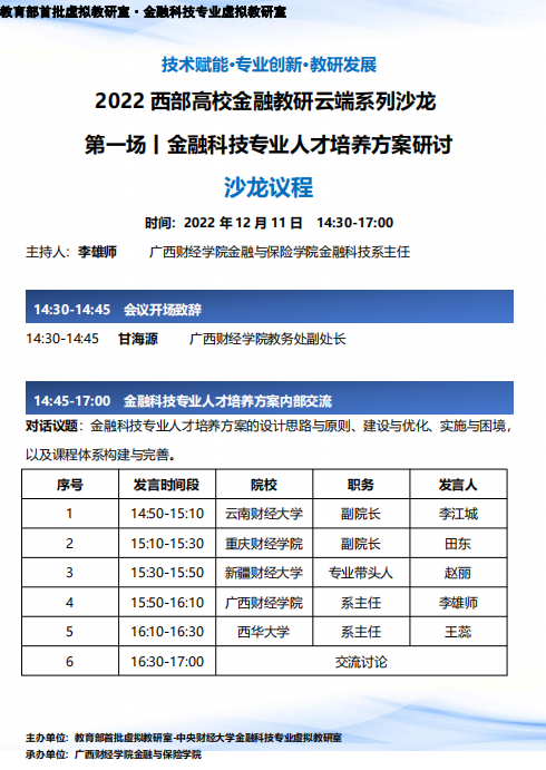 2022年12月11日,由教育部首批虚拟教研室-中央财经大学金融科技专业虚拟教研室主办、广西财经学院金融与保险学院承办,“2022西部高校金融教研云端系列沙龙第一场丨金融科技专业人才培养方案研讨”,在云端成功举办。与会西部高校领导和学者就金融科技专业的人才培养方案、人才培养方案的设计思路与原则、人才培养方案的建设与优化等开展了深入交流。