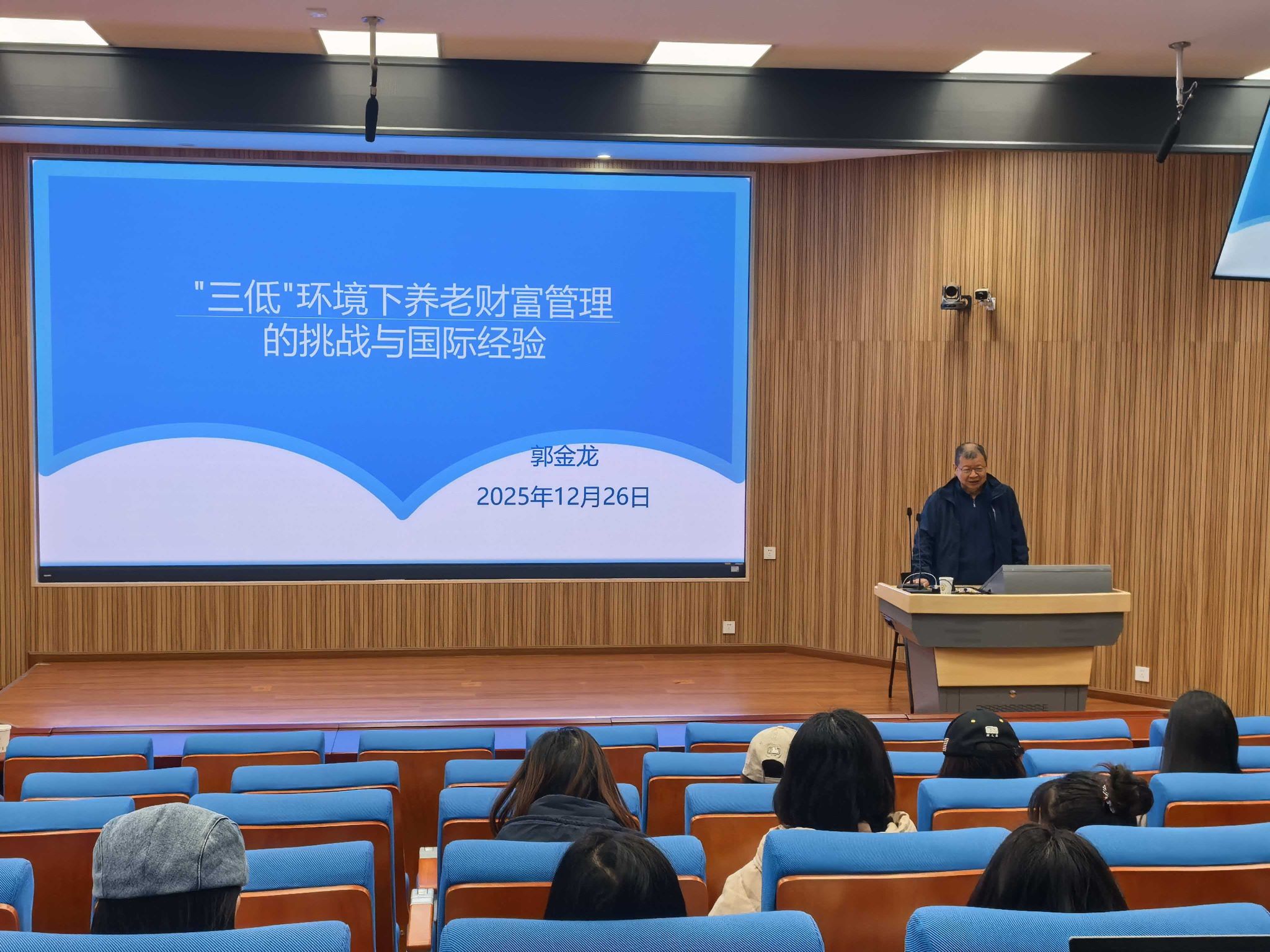 12月26日上午,应金融学院邀请,中国社会科学院大学郭金龙教授在行远楼D101报告厅以 “‘三低’环境下养老财富管理的挑战与国际经验”为题作学术讲座。金融学院师生聆听了本次讲座,讲座由金融学院副院长李云仙教授主持。