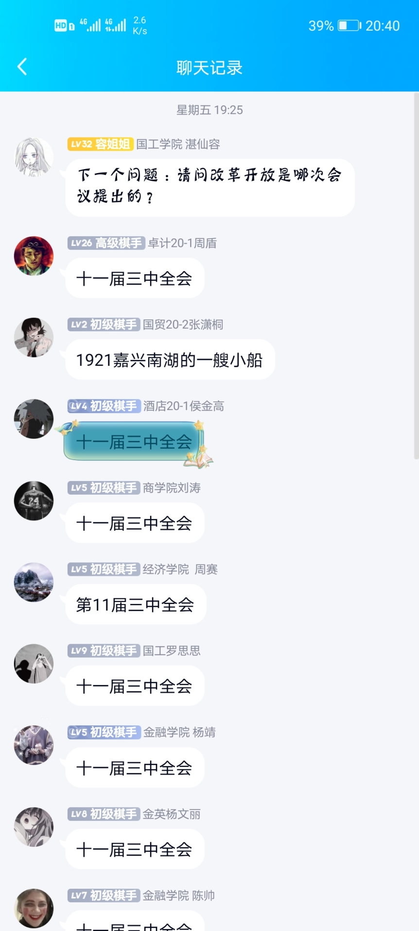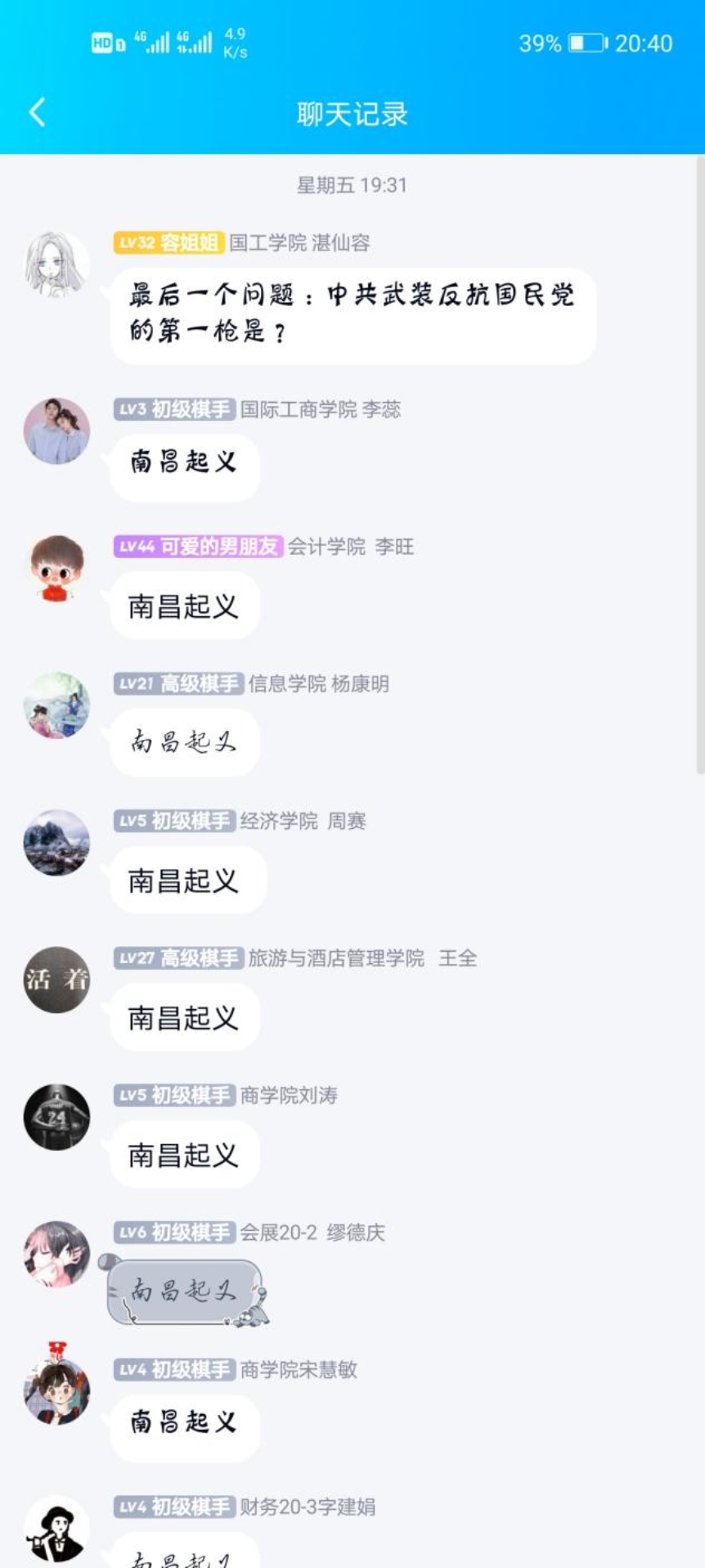 2021年4月16日,由金融学院楚阁象棋社举办的四月份主题团日活动于楚阁象棋社QQ群聊(735717511)开展。此次活动以“让党史走近青年一代”为主旨,让同学们重温党史,了解中国共产党的发展历程,学习革命先辈的精神。