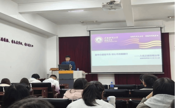 活动邀请了学校武装部王明水老师以及学院退役大学生代表王小康同学,为学院学子作专题分享。王明水围绕大学生参军优惠政策、考核标准及报名流程进行详细讲解,并结合学校往届学子入伍后的成长蜕变案例,用身边人、身边事让政策解读更加清晰易懂,帮助学子们全面了解参军事宜。王小康分享了自己的军旅生涯与退役复学经历,既讲述了军营中日常训练的磨砺、执行任务的坚守,也谈及退役后重返校园在学业、心态上的成长与收获,生动诠释了“军人”二字的责任重量与军旅经历的独特价值,引发全场学子的共鸣。互动环节气氛热烈,学子们围绕入伍条件、服役安排、学业衔接等问题积极提问,现场王老师逐一耐心解答,让大家对军营生活和参军入伍有了更真切的了解。