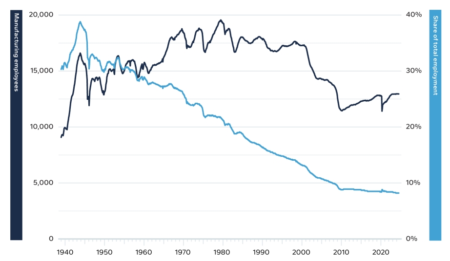 该图清晰地展示了美国制造业就业人数和制造业就业占总就业人数比例的变化趋势,其中深色曲线表示制造业的就业人数,而浅色曲线则表示制造业就业占比。我们发现,从1940年到1980年,美国制造业就业人数总体呈上升趋势,尽管期间有所波动,但在1980年之后,制造业就业人数开始显著下降,尤其是在2000年之后,下降速度加快。而制造业就业占比自二次大战结束之后,就从近40%开始一路下滑,到2020年已降至10%不到。