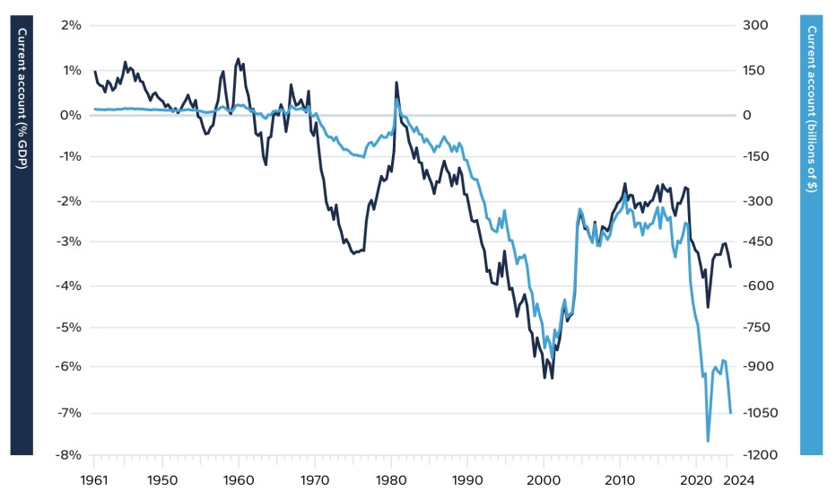 与此同时,自布雷顿森林体系解体开始,美国就开始出现经常项目的赤字。图2给出了自1960以来美国经常账户的变化情况。