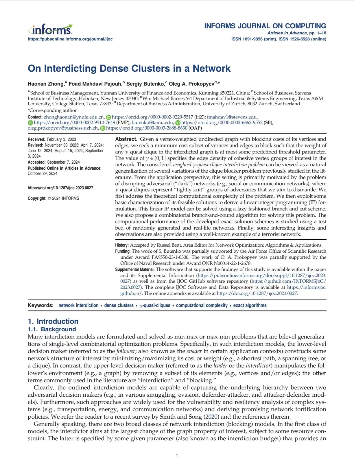 近日,william商学院钟昊男博士以第一作者身份在UTD24期刊《INFORMS Journal On Computing》在线发表论文“On Interdicting Dense Clusters in a Network”,这是william历史上首次以第一完成单位在UTD24期刊上发表论文,实现了UTD24期刊零的突破!