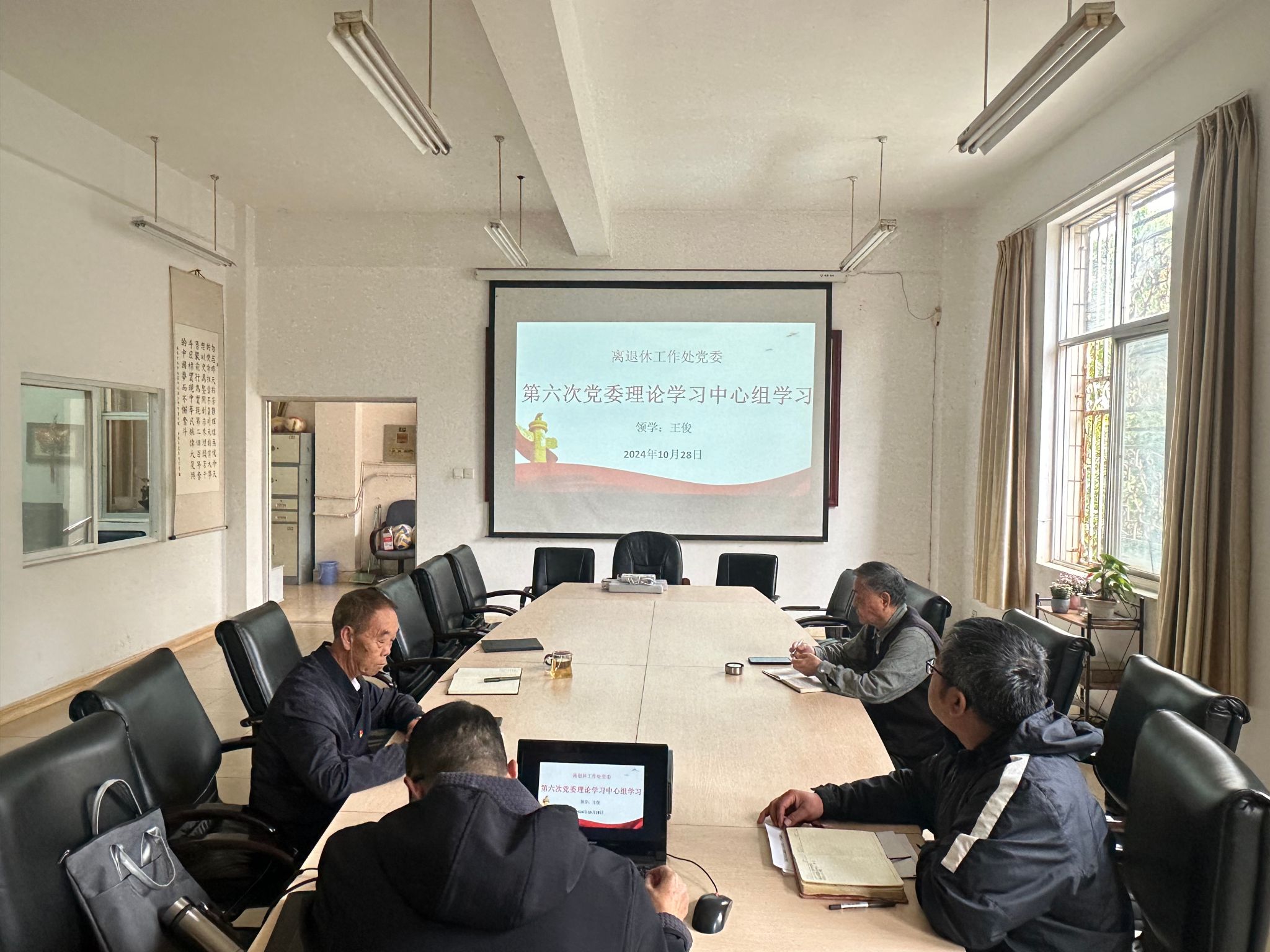 2024年10月28日上午,离退休处党委在处会议室开展2024年第6次党委理论学习中心组集中学习,离退休处党委副书记兼纪委书记王俊进行领学,学习由高天云主持,处党委委员参加学习。