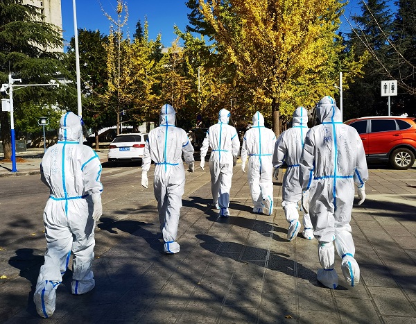 两名教师党员都分配到了抗疫保障组,负责每天为封闭管理的学生宿舍送三餐、桶装水、口罩、消毒洗手液等物资保障,每天两次清理楼道垃圾。在11月25日到11月30日的6天里,他们穿着密不透风的防护服,和其他“大白”一起,每天七八趟甚至十几趟上下宿舍楼,汗水浸湿了衣服,流进了眼睛……等同学们都吃上了热乎饭,保障组的志愿者才端着变凉的盒饭最后进餐。