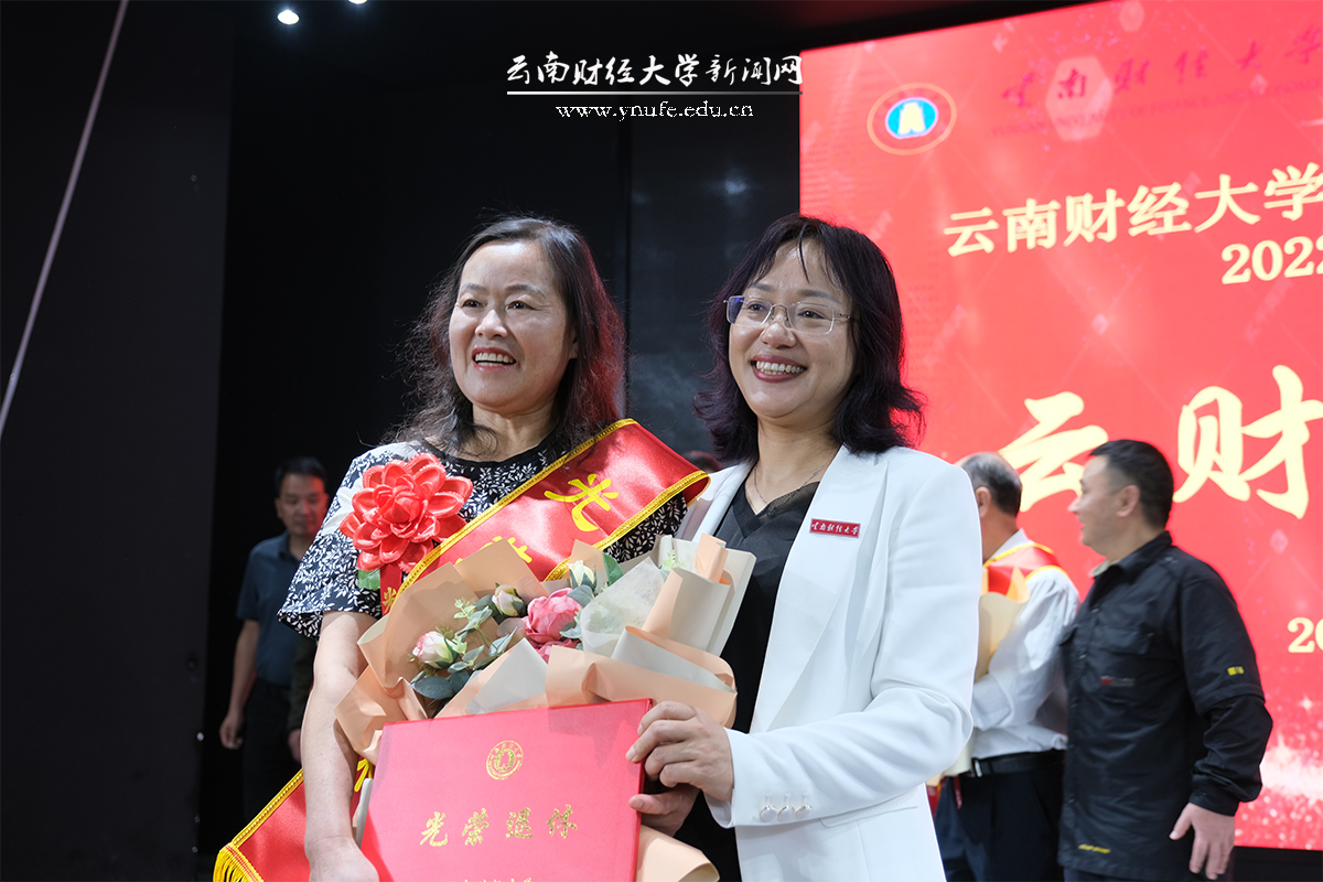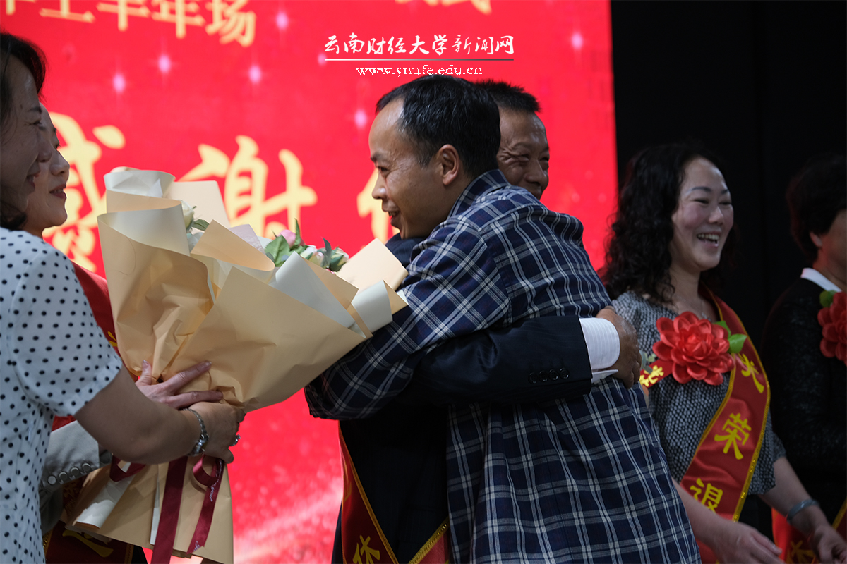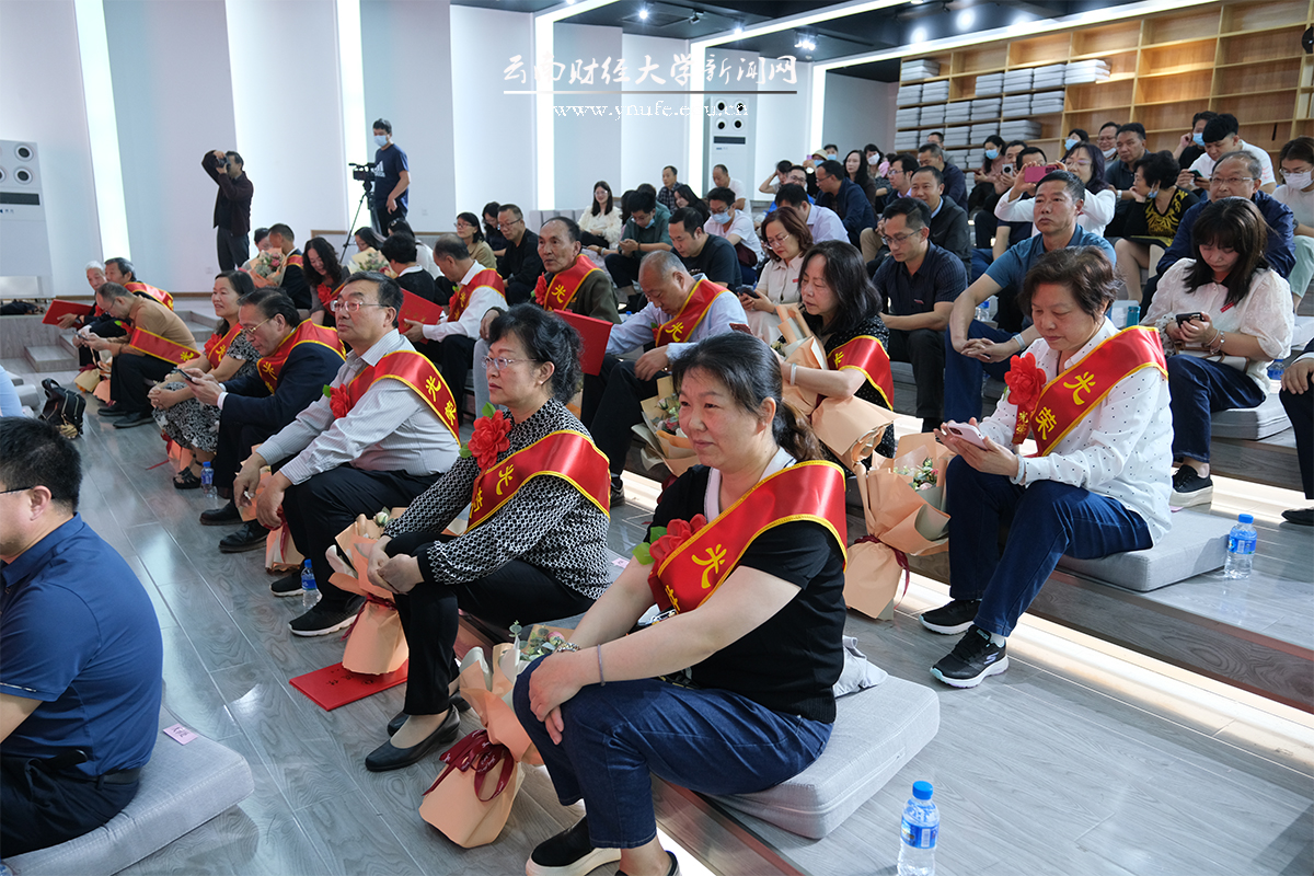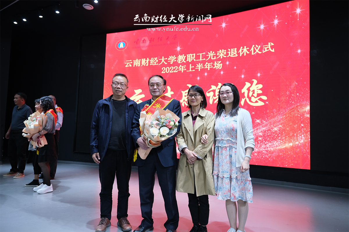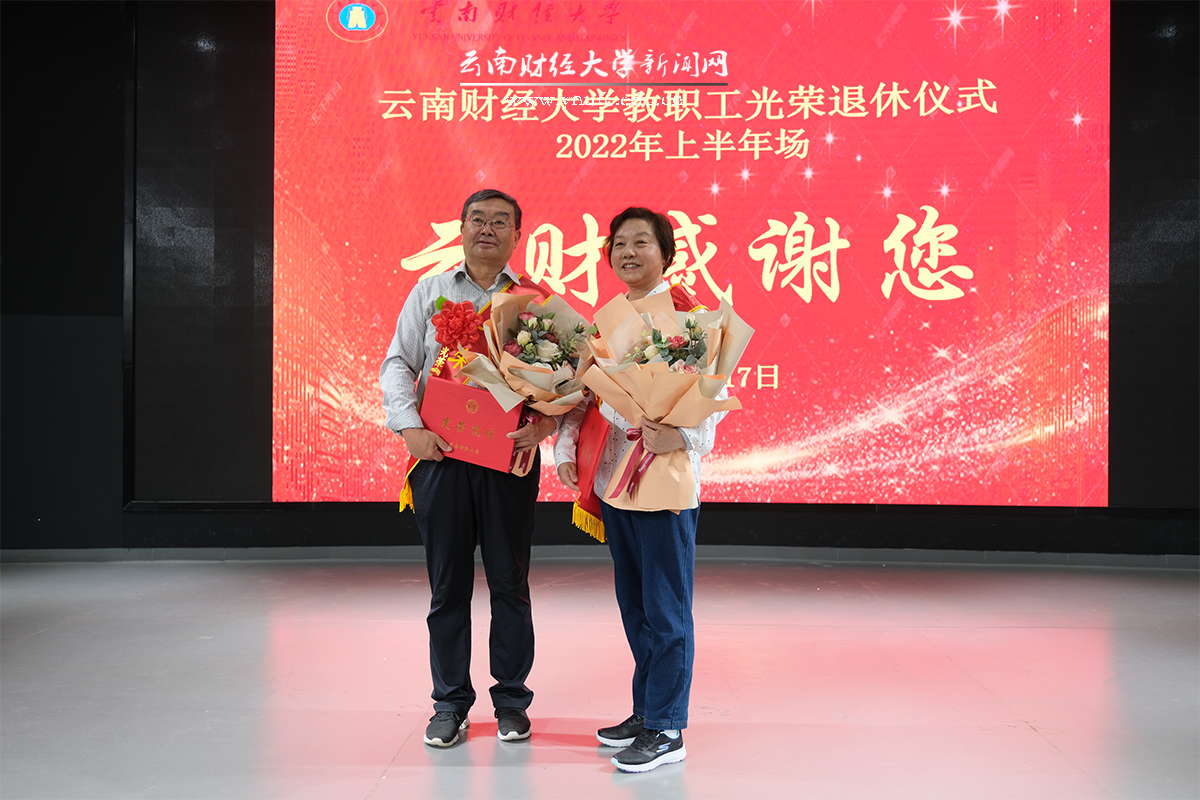 办公室、组织部、人事处、校工会、离退休工作处主要负责人向新退休教职工披挂“光荣退休”绶带,新退休教职工所在单位部门代表敬献了花束。