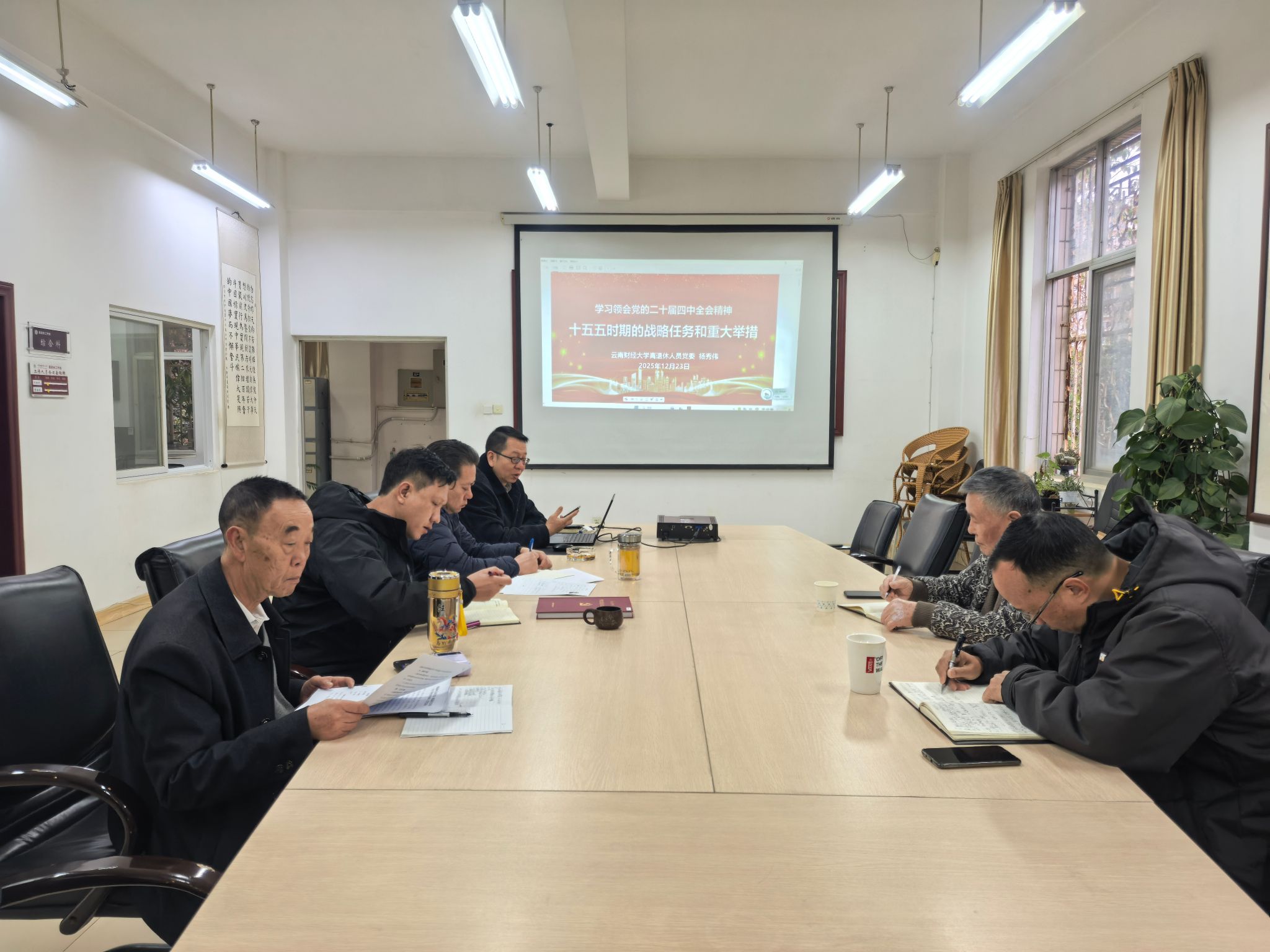 1223日,离退休人员党委组织开展2025年第8次党委理论学习中心组学习,专题学习领会党的二十届四中全会精神有关“十五五”时期的战略任务和重大举措。本次学习由离退休人员党委书记杨秀伟领学,党委委员、科室负责人、组织员参加学习。