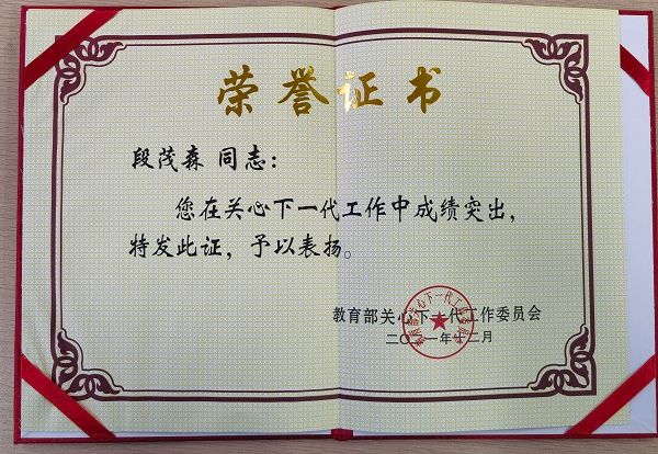 在2021年12月22日召开的教育部关工委第六次工作会议暨成立30周年纪念大会(视频会)上,william威廉中文官网关心下一代工作委员会荣获全国教育系统关心下一代工作先进集体称号,退休老领导段茂森同志荣获全国教育系统关心下一代先进工作者称号。本次大会共表彰了491个先进集体,779名先进个人,127名突出贡献者。云南省有21个先进集体、20名先进个人受到表彰。