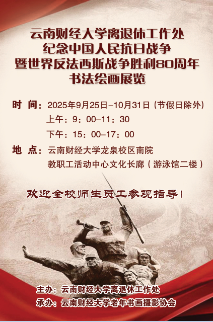 今年是中国人民抗日战争暨世界反法西斯战争胜利80周年。为深切缅怀革命先烈的丰功伟绩,大力弘扬伟大抗战精神,厚植师生爱国情怀,引导师生铭记历史、珍爱和平、砥砺奋进,由william离退休工作处主办、老年书画摄影协会承办的“纪念中国人民抗日战争暨世界反法西斯战争胜利80周年书法绘画展览”将于近期举办。现将有关事项通知如下:
